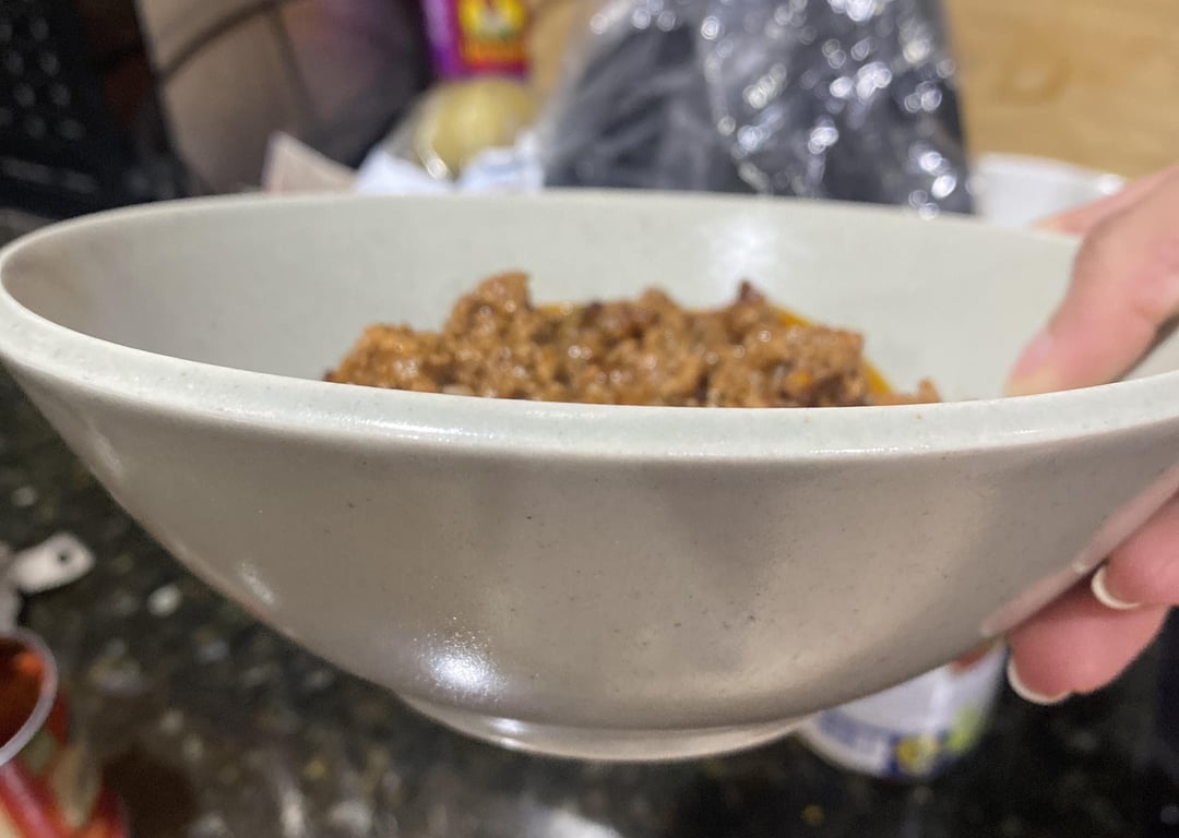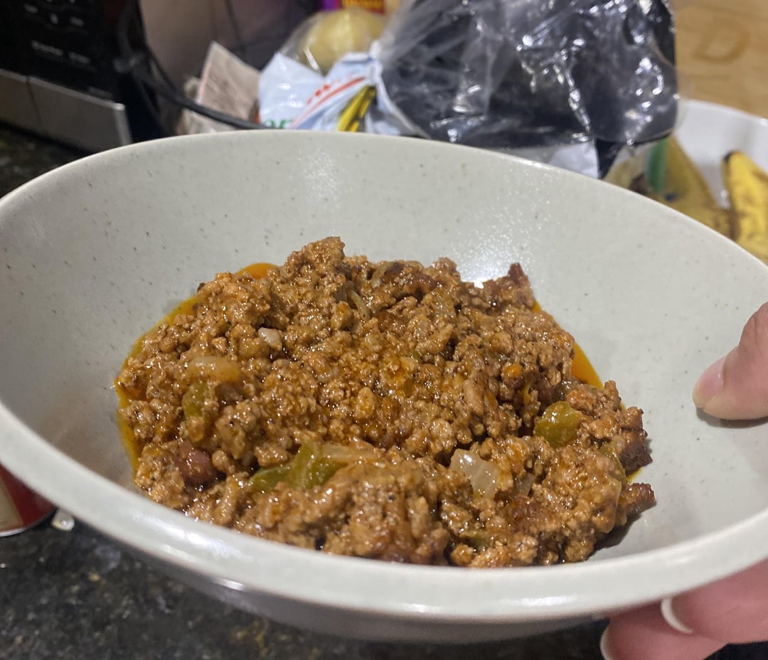 Made with onions, beans, ground meat. I don’t think there’s tomato sauce in it so idrk what the liquid is made of, but since it came from a much larger pot, if there’s any oil it’s not a huge amount because there’s likely not a huge amount of oil in the pot it came from