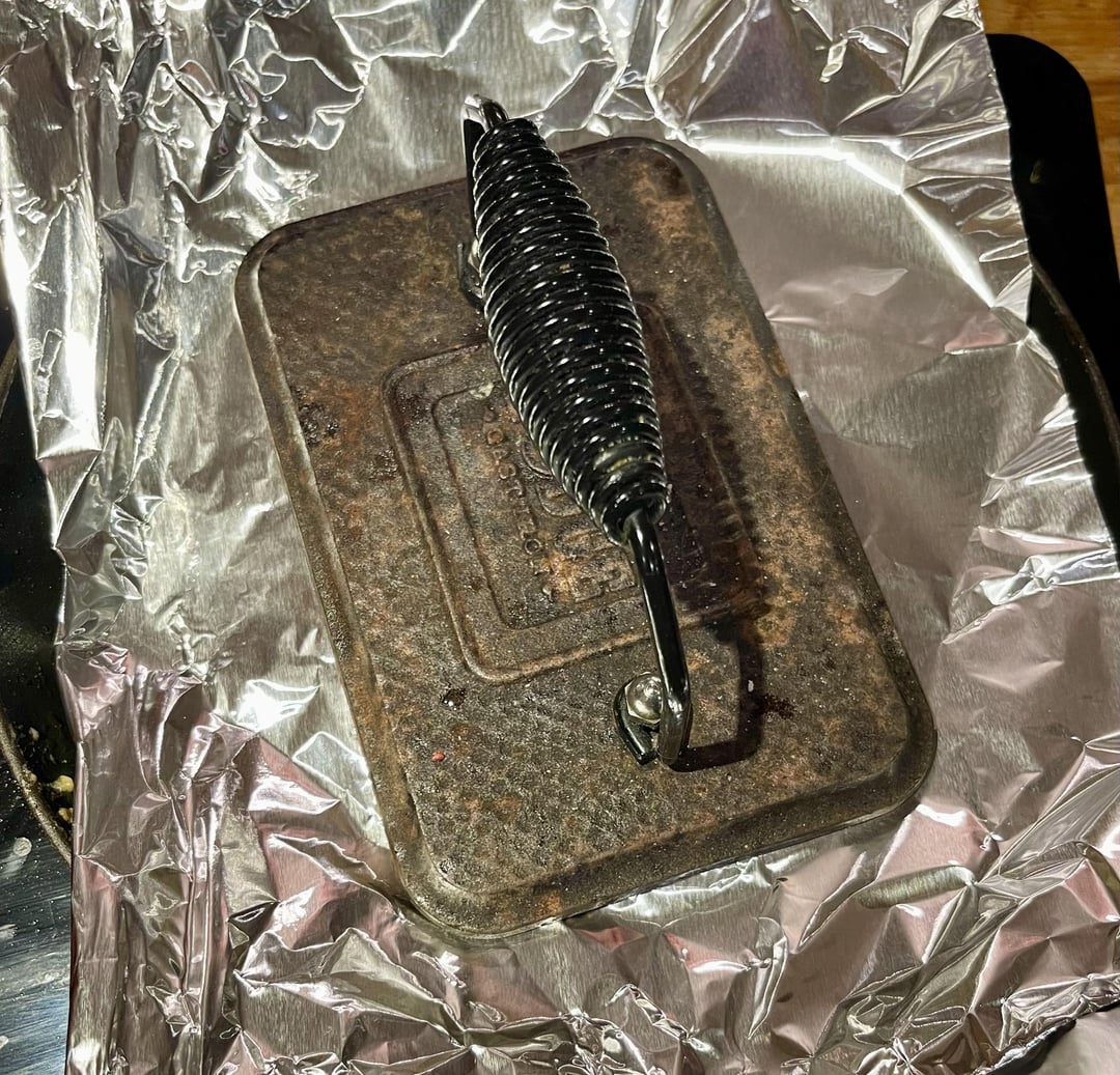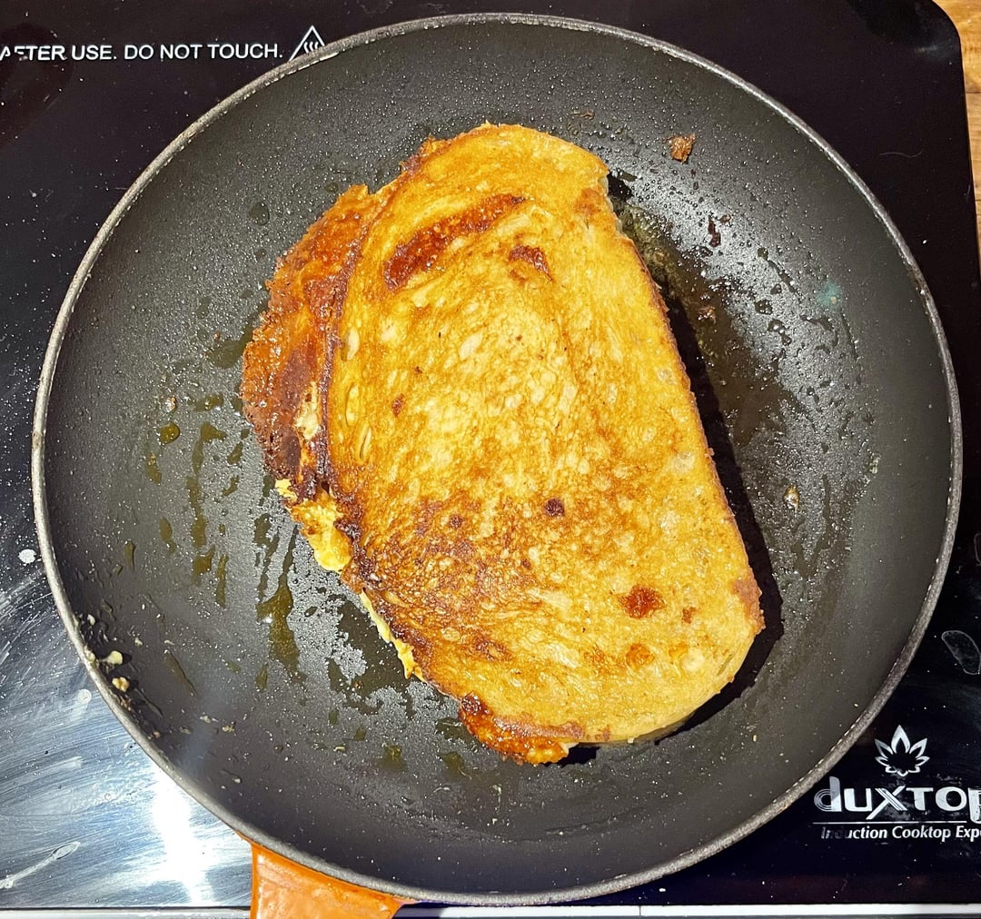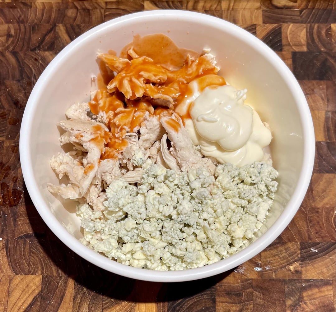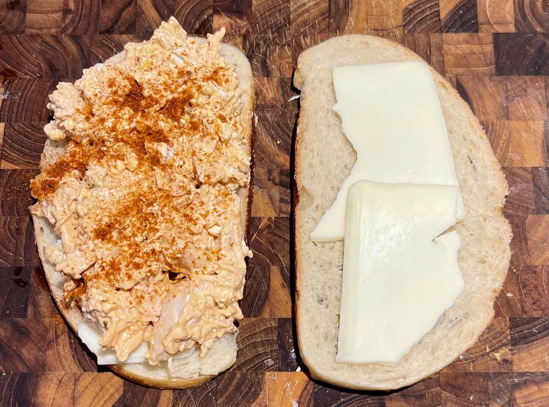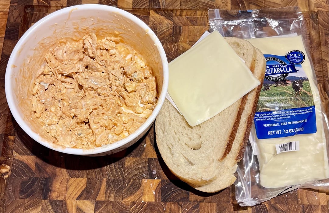 a grilled sandwich on sliced french loaf with a buffalo chicken mixture (sous vide shredded chicken breast, blue cheese crumbles, frank’s red hot, and mayonnaise) and mozzarella cheese. i added some dave’s hot chicken reaper powder to kick up the spice.