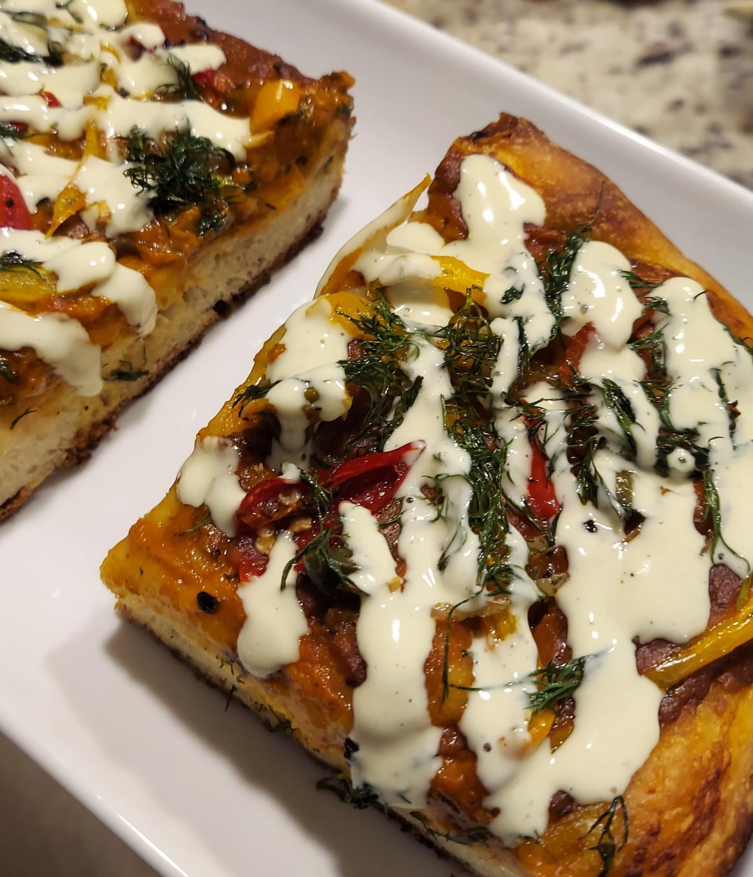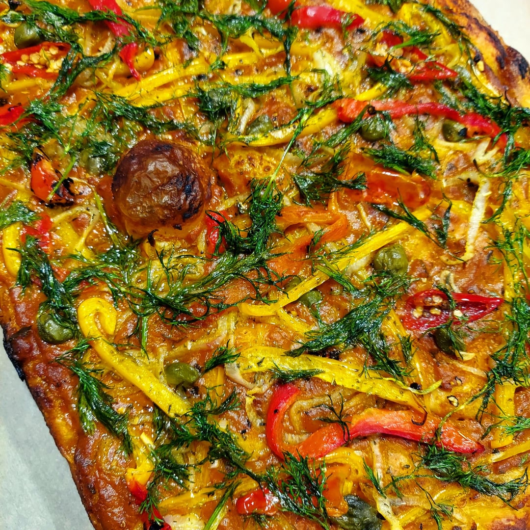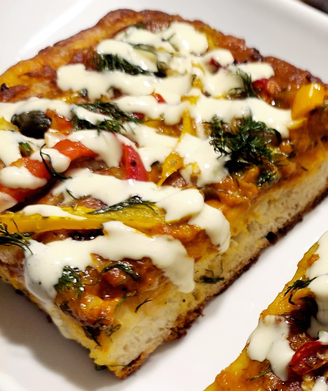 Made a focaccia pizza but realized, after the dough had "proofed" for a bit, that I had forgotten to add yeast; added some yeast and a pinch of sugar to warm water and then combined with the dough. Topped with tomato sauce, roasted red and yellow peppers, shallots, capers, dill and cashew cream.