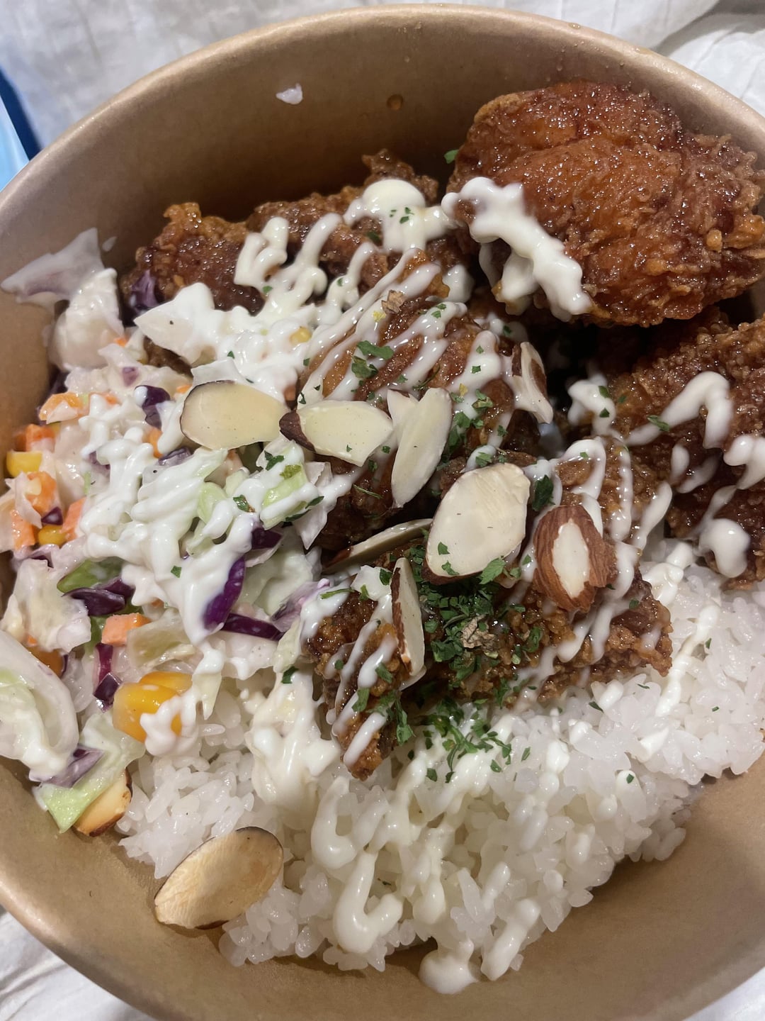 Kokodac Soy Garlic Chicken Bowl. Korean Fried Chicken, rice and coleslaw. One of my favourite treat meals so wanted a calorie estimate. Cheers!