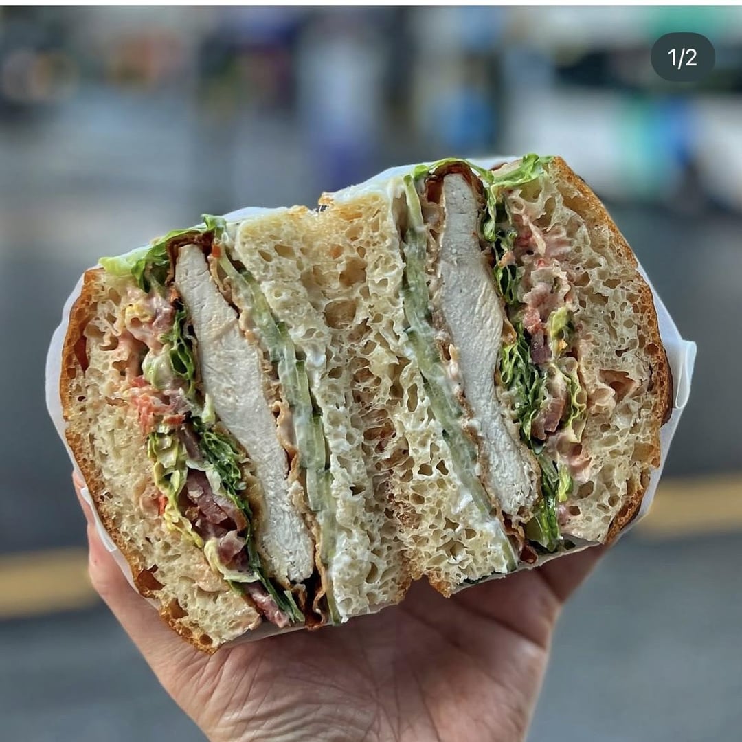 attached pictures for size reference/visual, listen ingredients: fried chicken breast, caesar salad, crispy bacon, pickles, sunblushed aoili and (obviously) foccacia