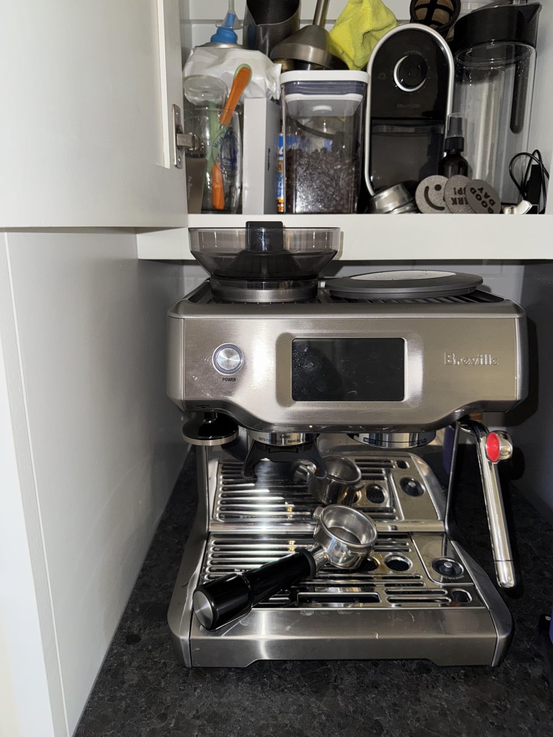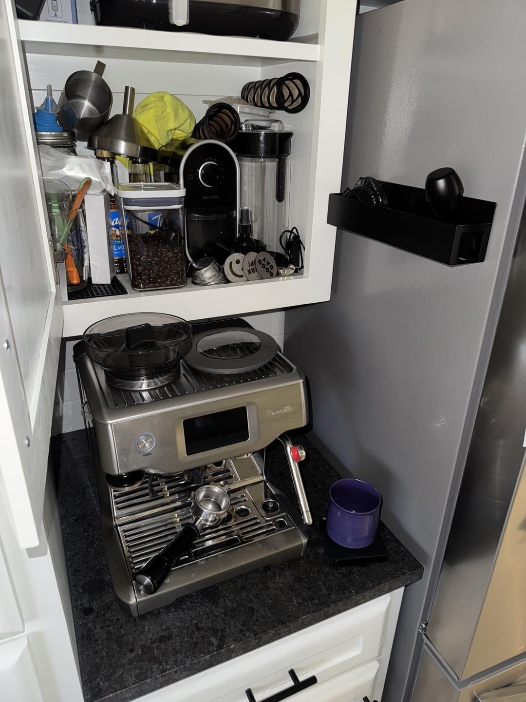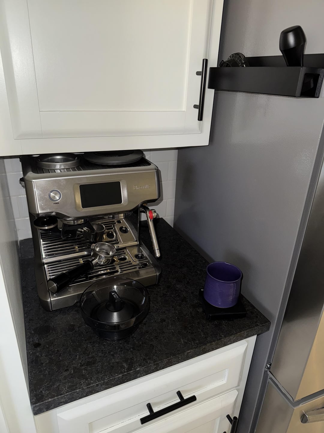 I would recommend selling your existing espresso machine and getting a smaller machine and separate grinder that fits the space more appropriately… maybe a bambino with a df54 grinder etc…