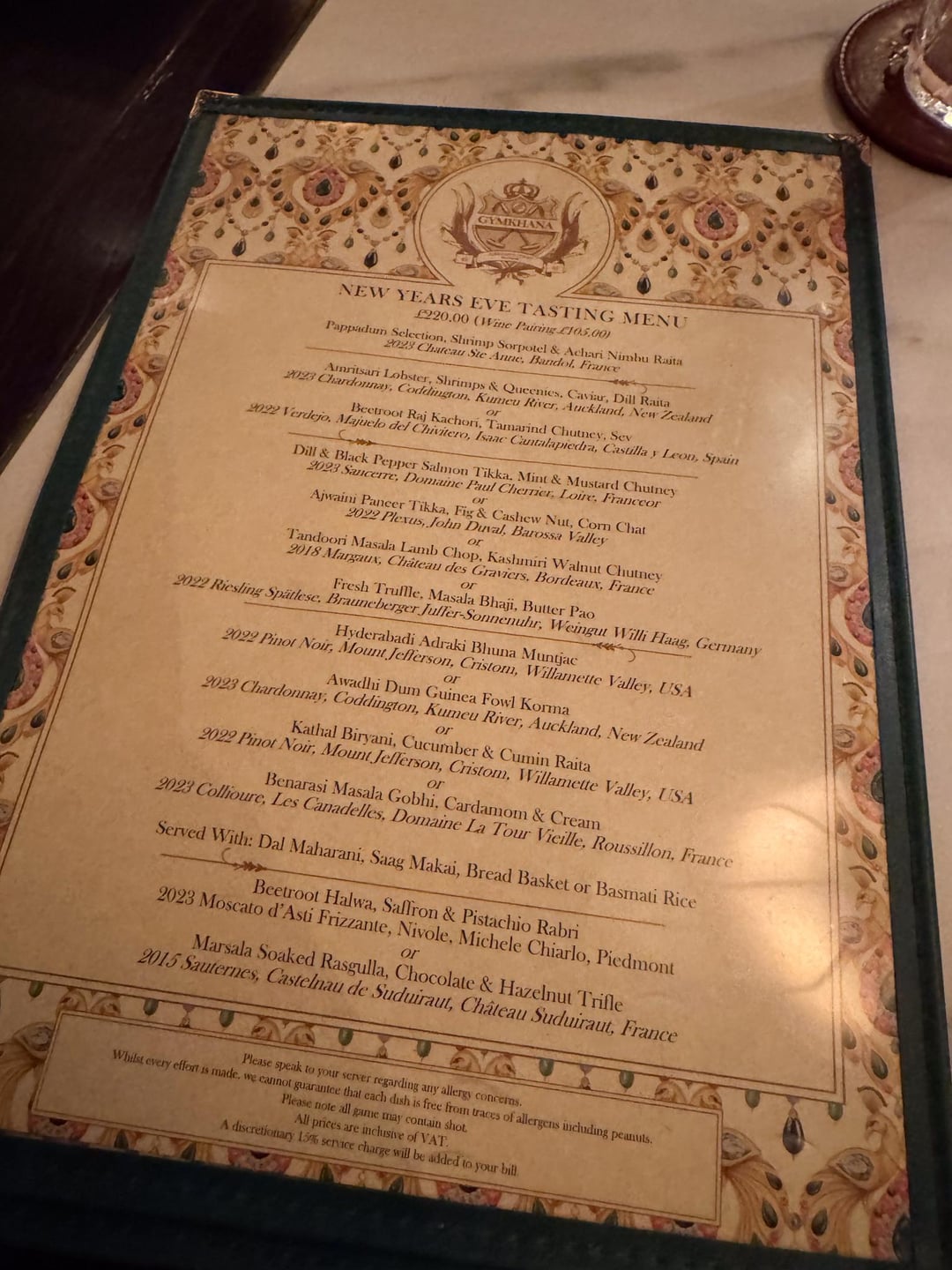 There was a special NYE tasting menu which was steeply priced with a 50% premium over their usual tasting menu. In general, we liked the meal, but it didn’t seem 2-star good. Some of the ingredients were certainly evevated (e.g. the lobster and caviar). One of our favorite dishes was the beetroot halwa for dessert.