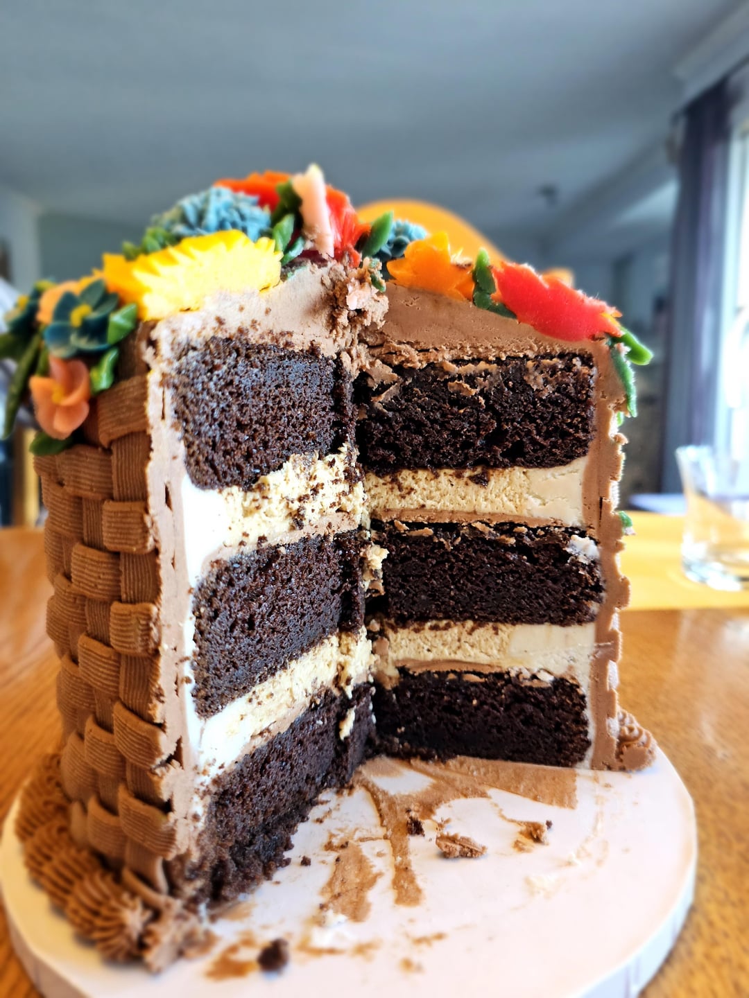 It's a super moist fudgy chocolate cake with peanut butter mousse filling and PB frosting. Florals are vanilla.