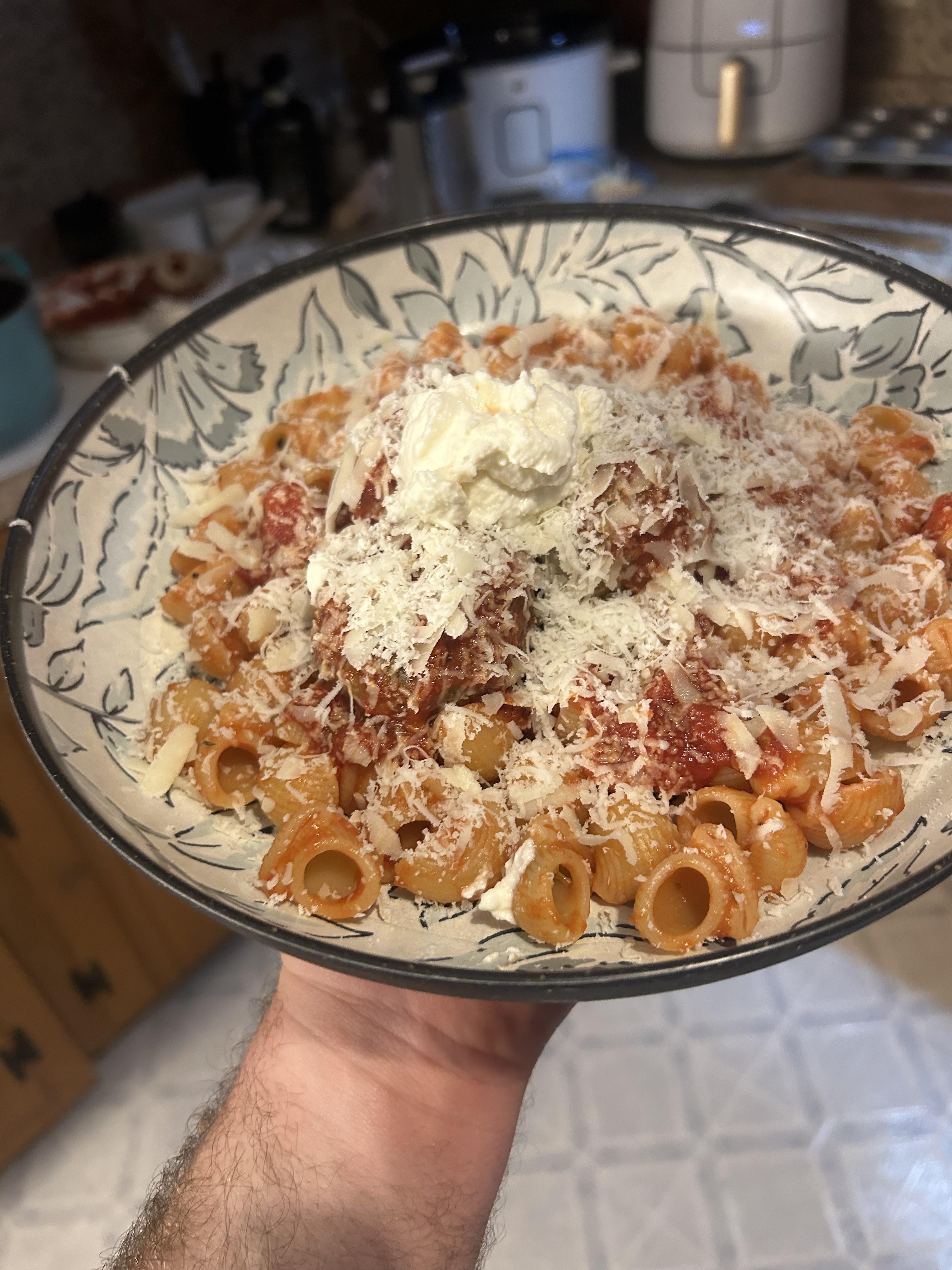 Big elbow rigate and meatballs with a simple marinara topped with pecorino Romano and ricotta 😘🤌🏻by Captain-Red_beard 1 Comment Milanesa_Torta 9 months ago Yessss, that looks appetizing.Is that a sour cream dallop garnish, to go with savory of parme and meatball???Write A CommentYou must be logged in to post a comment.
