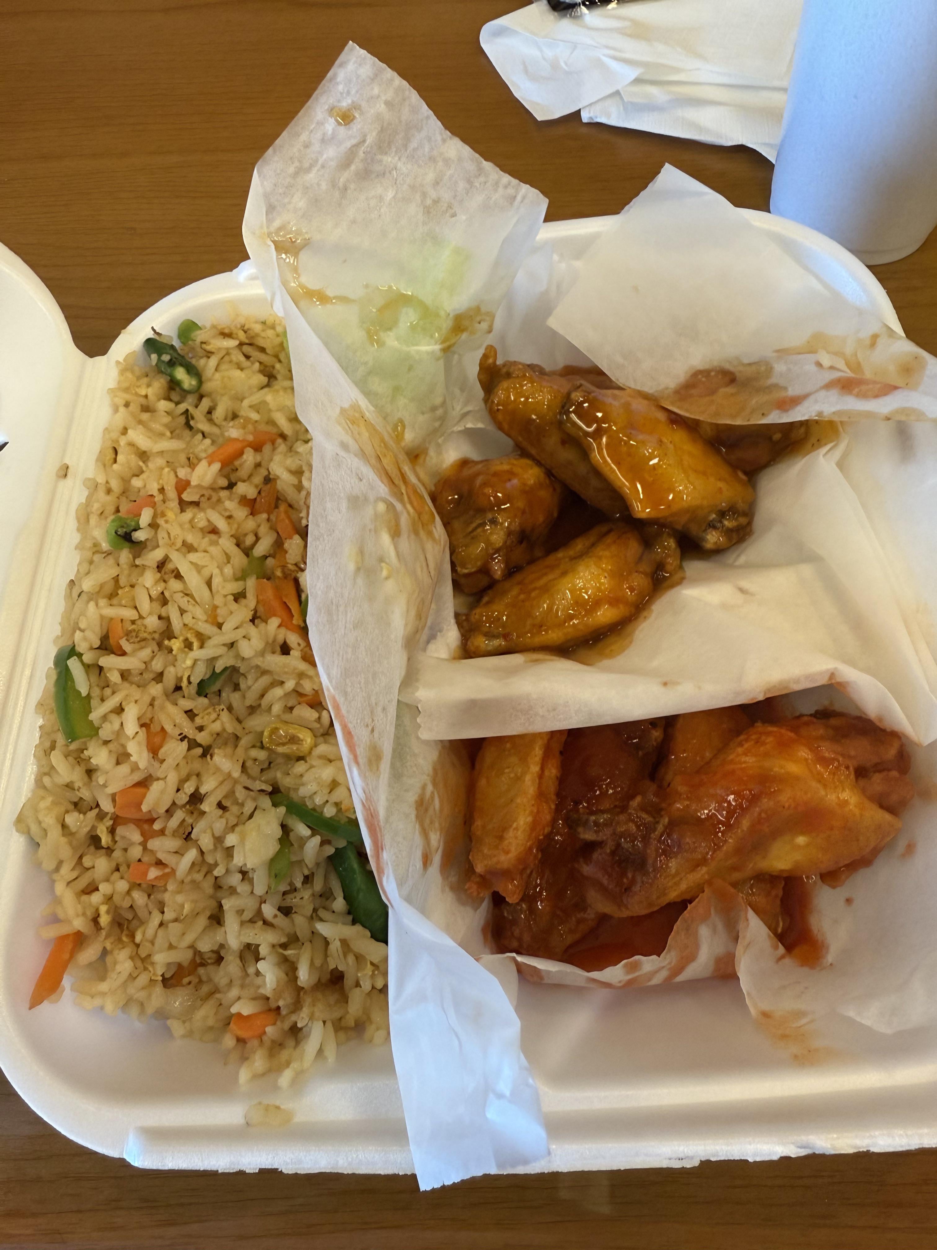Sorry for the horrible pictures. My colleagues and I are on a trek to find the best wings in our area so we travelled about 15 minutes to this place for lunch. 1st things 1st; when you walk in it smells like dirty oil. Ordered half hot half mango habanero. Wings came out piping hot and the hot was good and the mango habanero was great after I dunked them into the regular hot. It was the perfect marriage of mango and heat. The fried rice was good but I was not a fan of the green peppers in it. Wouldn’t go back just due to the location and value. (10’wings with fried rice $18)