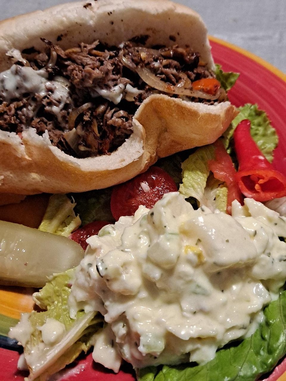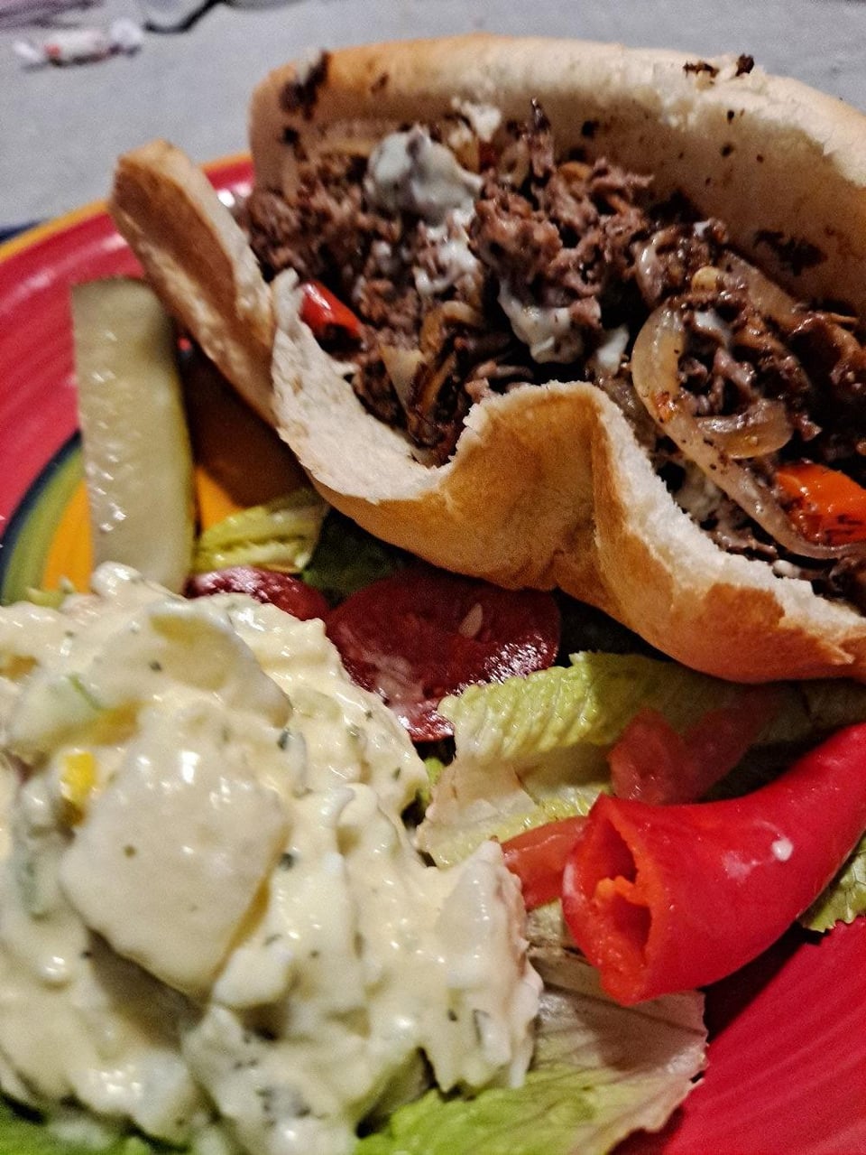 Whats going on here? Philli no peppers? Tater salad on top of greens with tomato? Friendly question, no judgment.