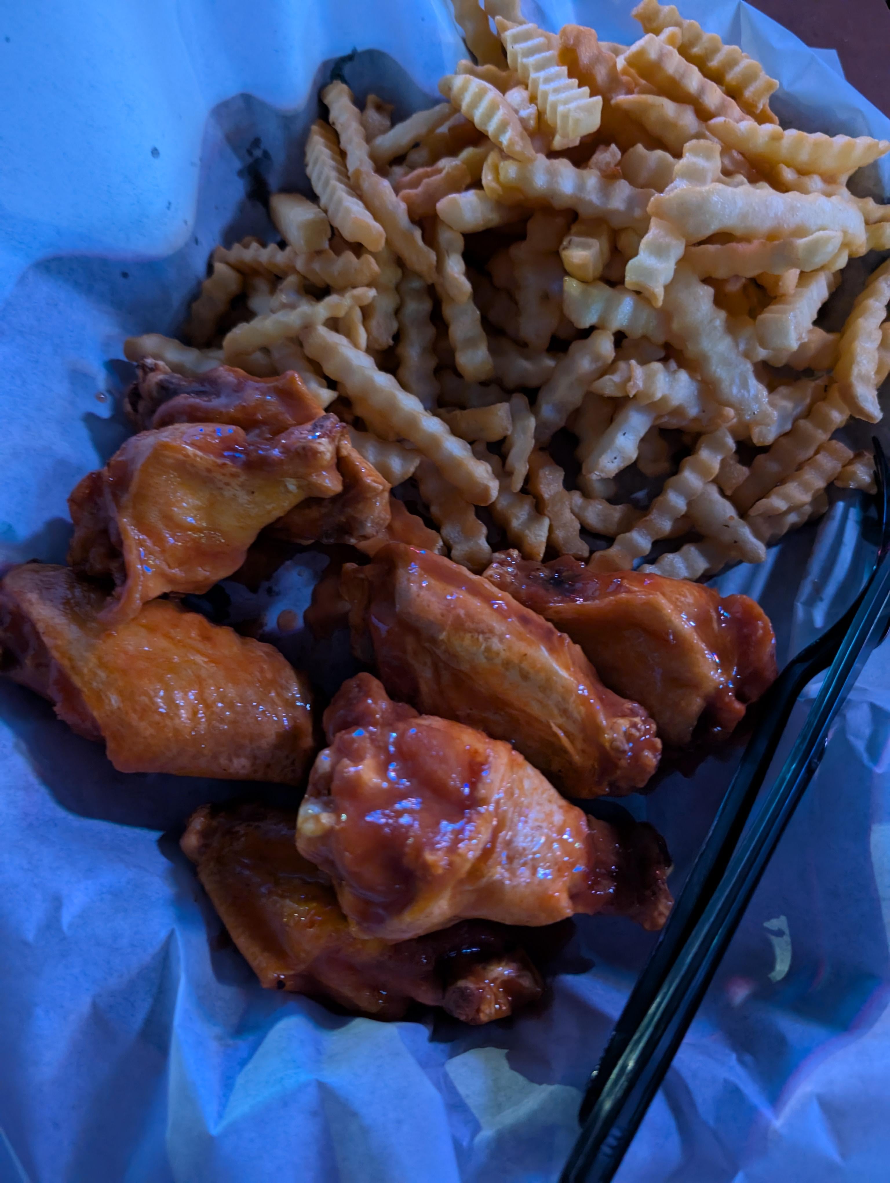 bluecollarclassicist 9 months ago Pretty solid – 8 wings and fries for $14. Wings are extra large, cooked well, and came out piping hot.. I got more sauce for dipping.