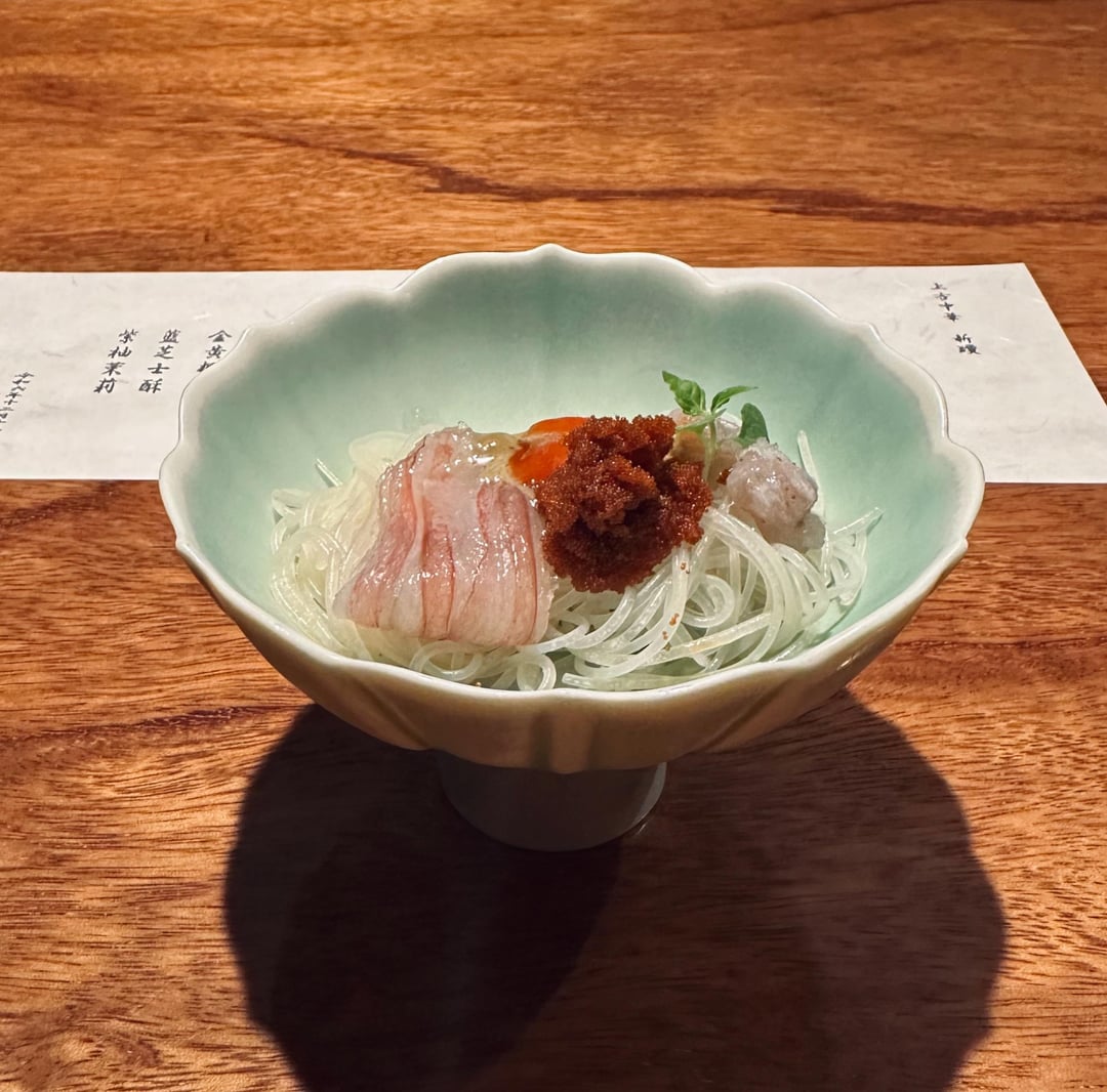 ***Crab rice noodles*** – The deconstructed presentation of the crab butter, roe, and flesh reminded me of the three shrimp noodles from Suzhou, in which the shrimp is deconstructed in a similar manner but cooked over oil and assembled over wheat noodles. This dish using raw crab did not taste like the original — unexpected at first (for a second, this was going to be another kaiseki tasting menu), yet on second thought, this dish encapsulated the same principle as the three shrimp noodles — utilizing of fresh, local ingredients and letting those natural flavors bloom. The localization of using crab over rice noodles did exact that, and I would soon realize that ingenuity was going to be present throughout the entire meal.