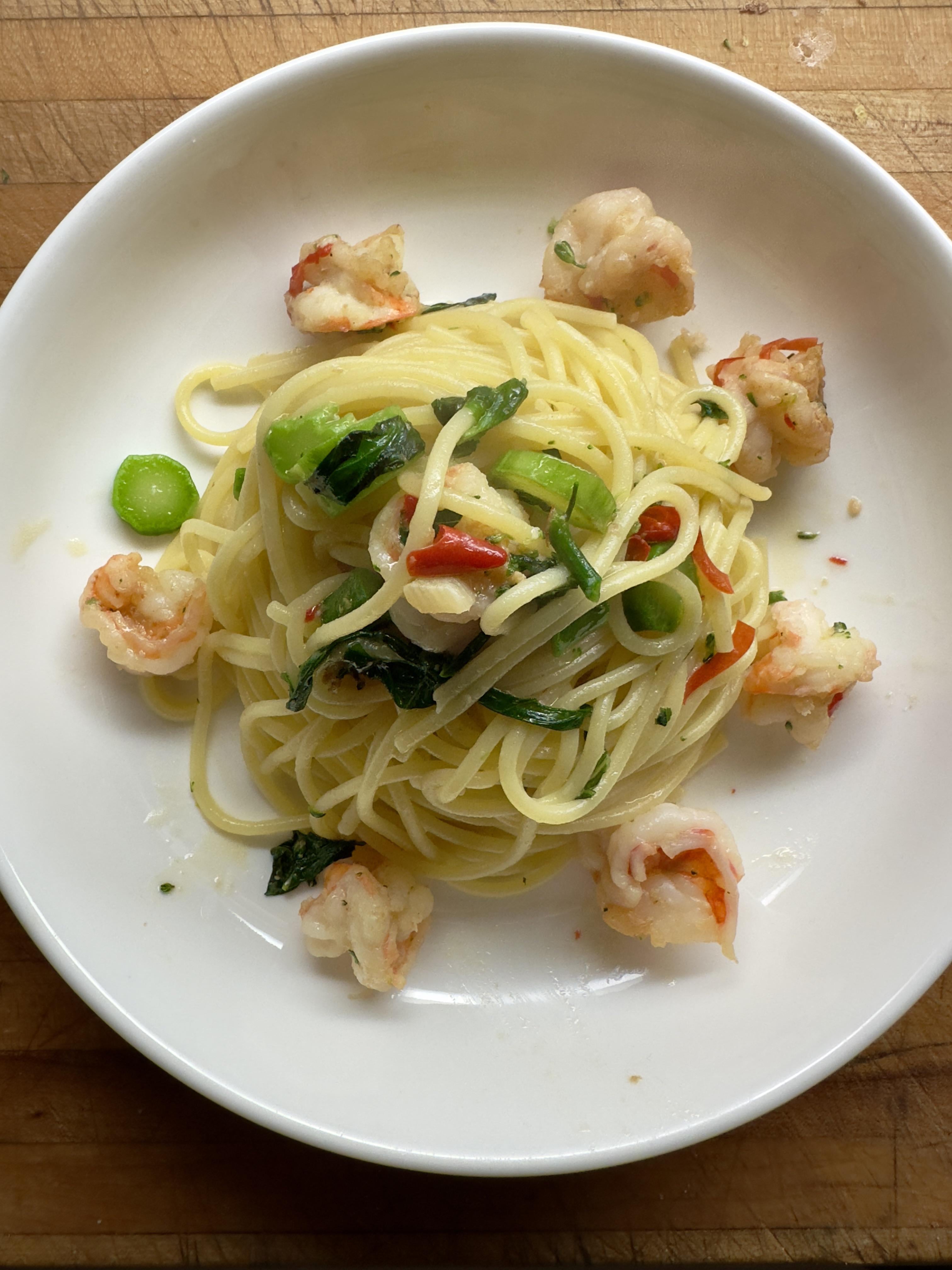 This seems like a fake AI thing. The photo does not look at all like what the recipe “tries” to describe, that being a well emulsified and coherent sauce. Looks more like some strangely cut shrimp/prawns geometrically placed on the plate with a staggeringly low amount of “broccolini” and some incoherent “red” that being the “chili” placed on top of some very dry looking pasta.
