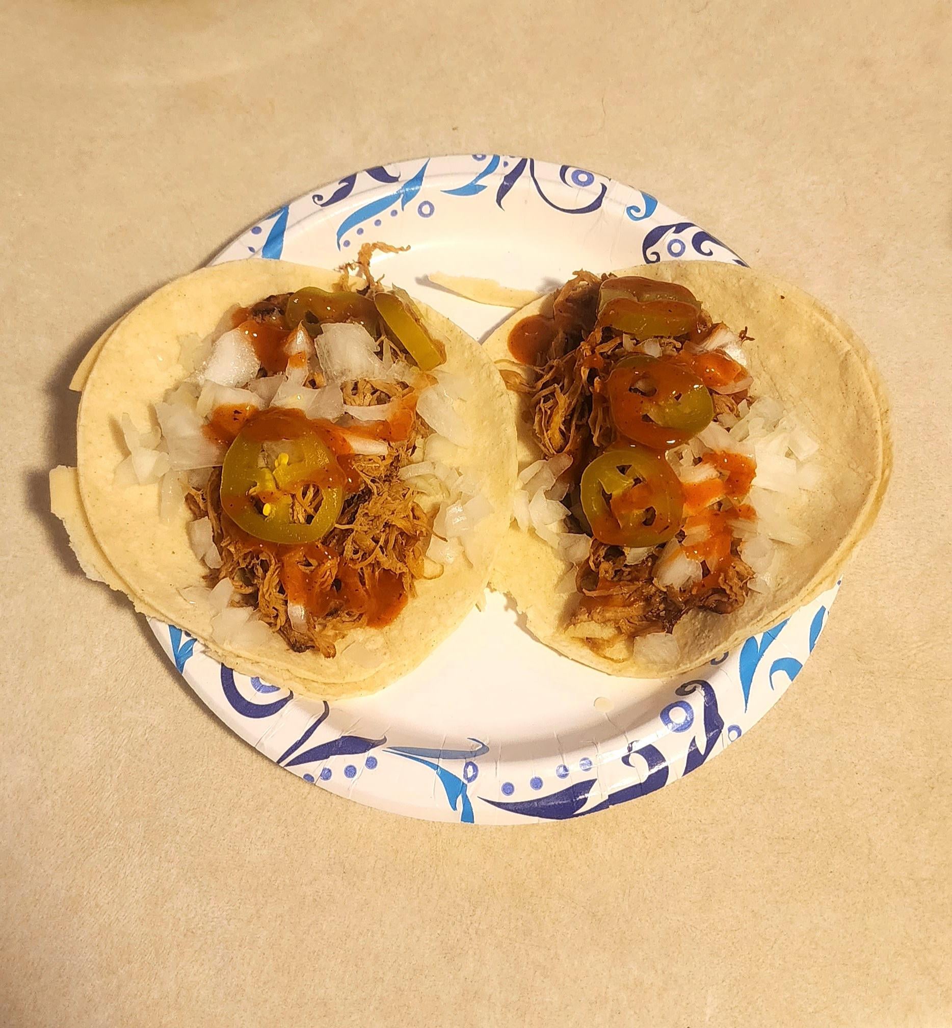 Slow cooked some pork shoulder, fried it in a pan with some Asada spice mix from Walmart, diced an onion and hit it with some jalapeรฑos and some Melinda's hot sauce. These sure hit the spot! by Gex2-EnterTheGecko Write A CommentYou must be logged in to post a comment.