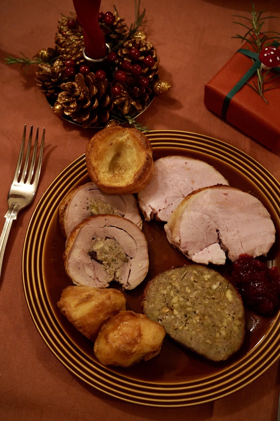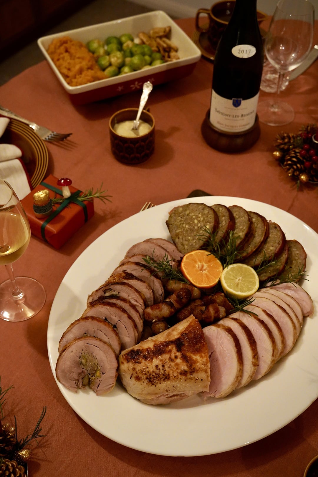 Turkey deboned, and separated into breasts, and legs that were stuffed with pistachio and cranberry stuffing.