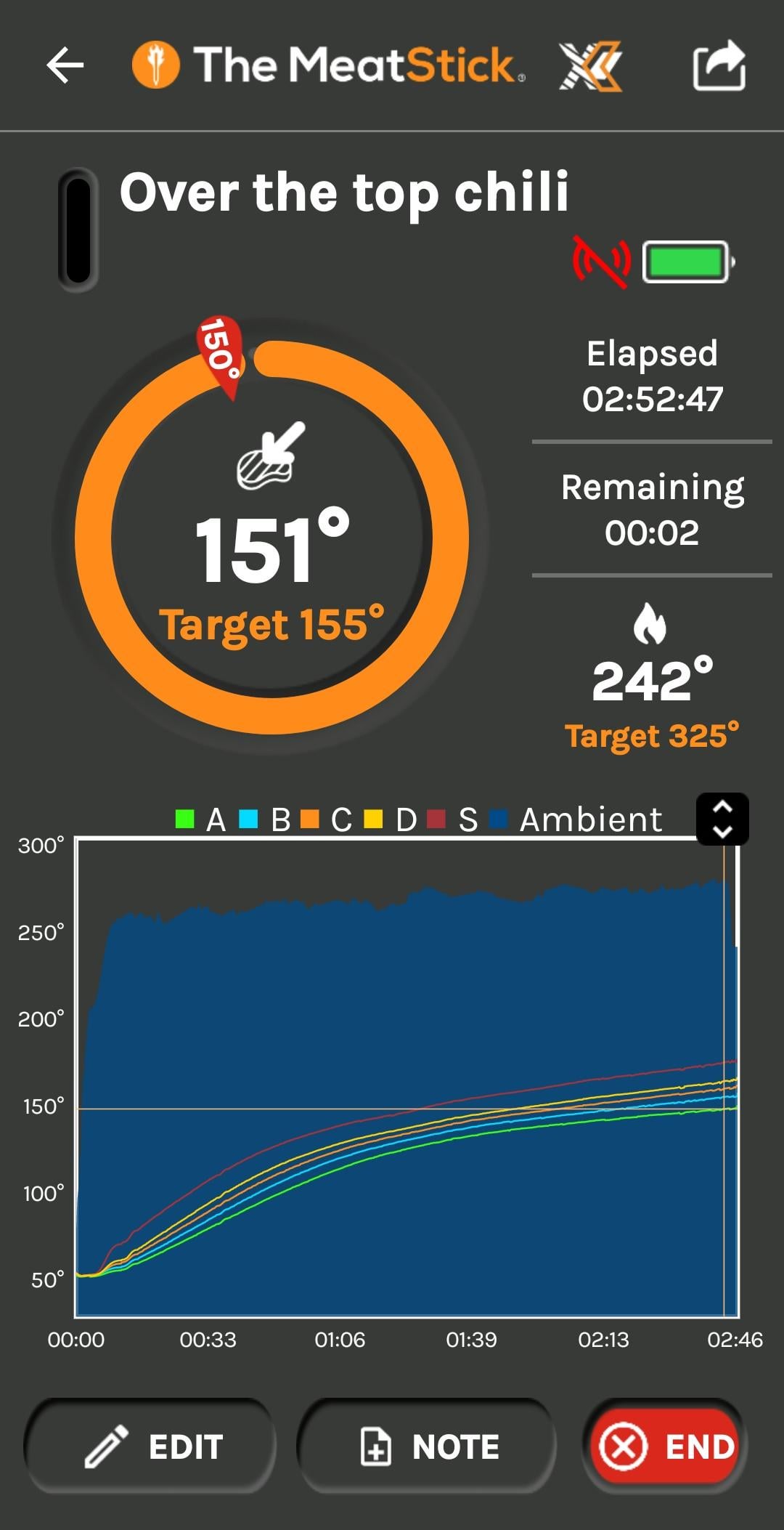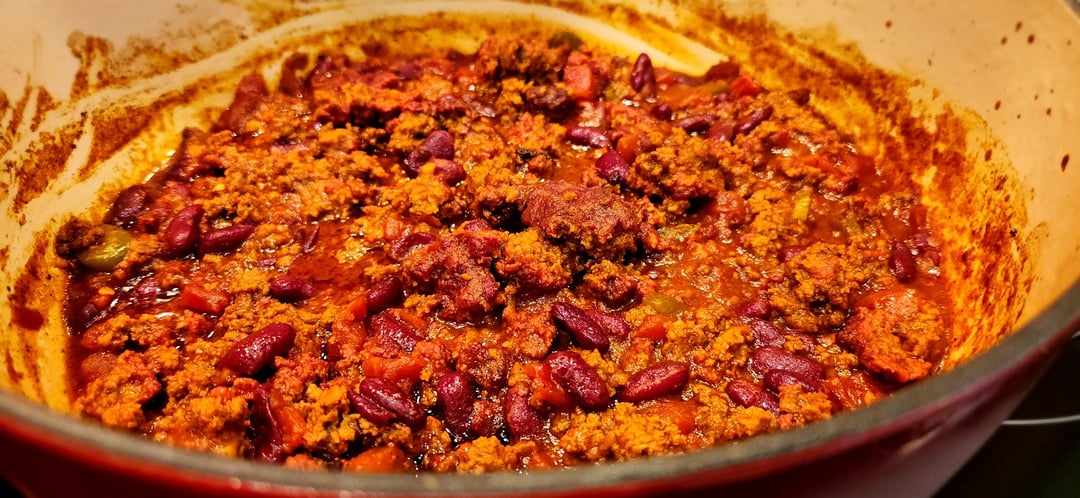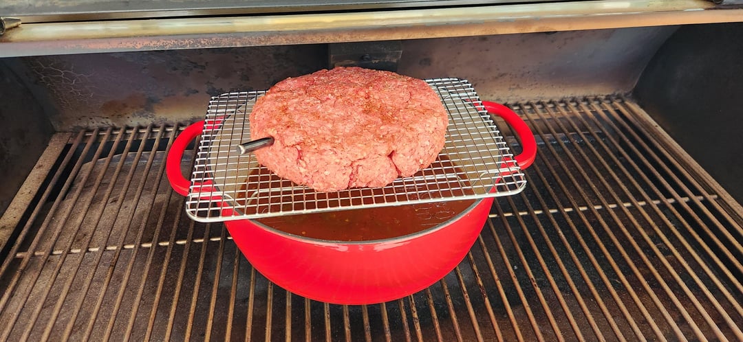 Dutch oven chili 2lb 80 20 ground chuck mixed with 2 tbls killer hogs bbq rub form into puck. In pan mix 2 cans dark red kidneys, hot rotella matas 1 can, hunts mata sauce 2 8oz cans. with 2.5 cup chicken broth better than bouillon, 1/2 teaspoon cayenne, 1/2 tsp mexican hot chili pwdr, heaping table spoon Mazzetta hot sliced jalapeños and juice, plus a 1/4 tspn really hot, hot sauce. 1/4 tspn salt and pepper McCormick mild chili mix. 1/2 tspn red pepper. Recteq to 325, with baking rack over top and meat over chilli. Cook for about 2hrs until meat is 150° center. Pull both out and shred meat into chili and replace with lid for about 30 more min. Perfecto. add a pinch of killer hogs AP rub next go around.