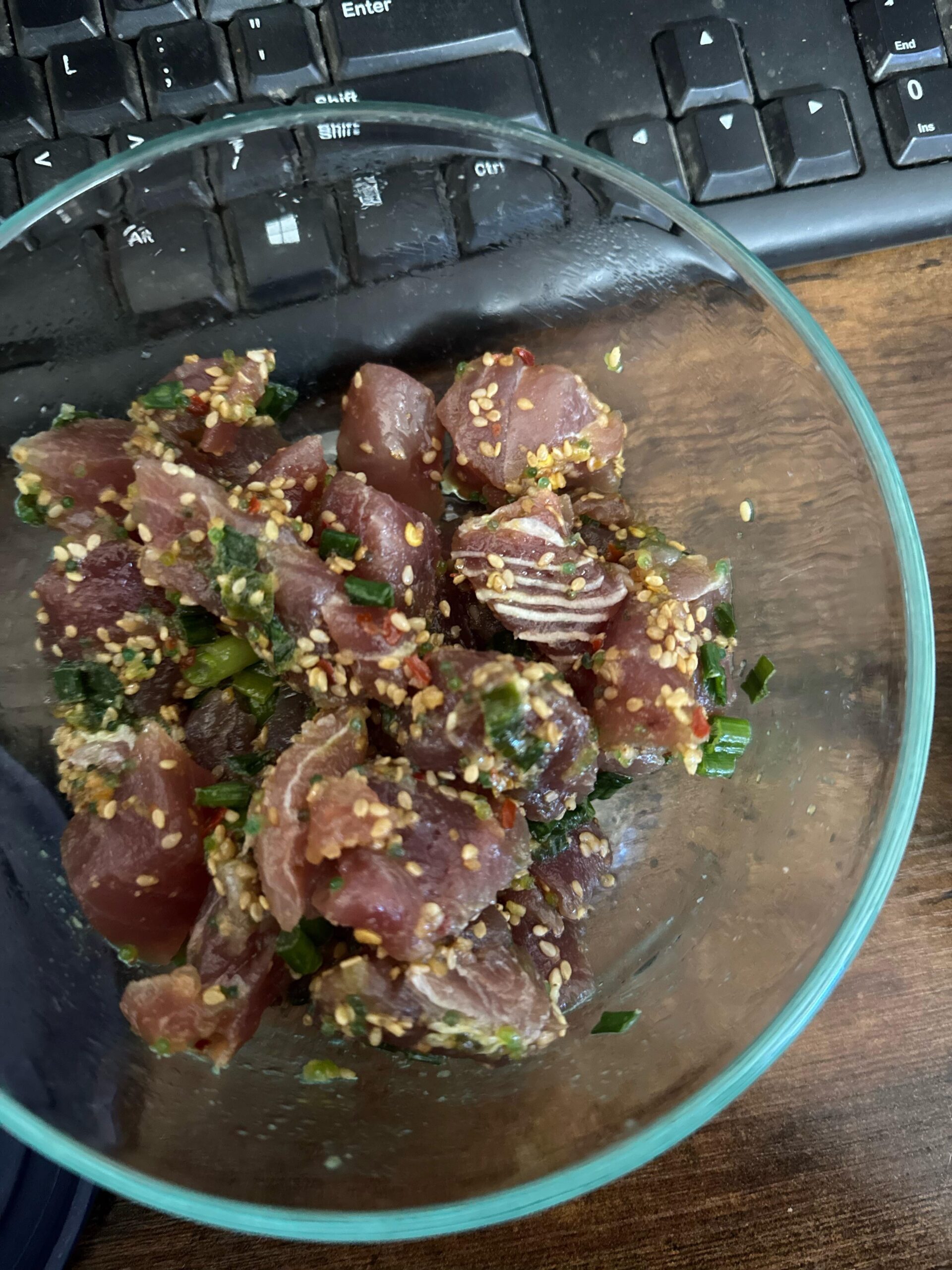 If you catch and process a tuna at home, you will notice that many cuts of meat have connective tissue running through. It doesn’t affect the flavor, but does affect the texture. I usually use those pieces for Poke or I strip out the connective tissue and mince the remaining meat to make spicy tuna rolls.