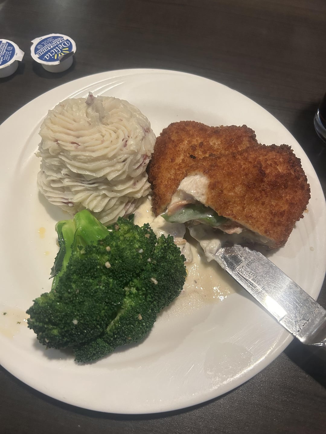 boblin517 1 year ago fried chicken breast with cheese and ham: 600 asparagus is negligible. mashed potatoes with butter: 200