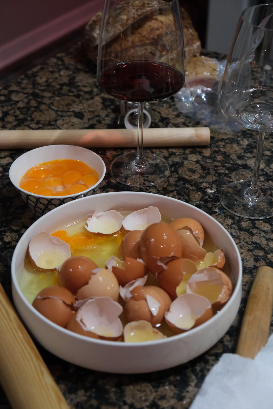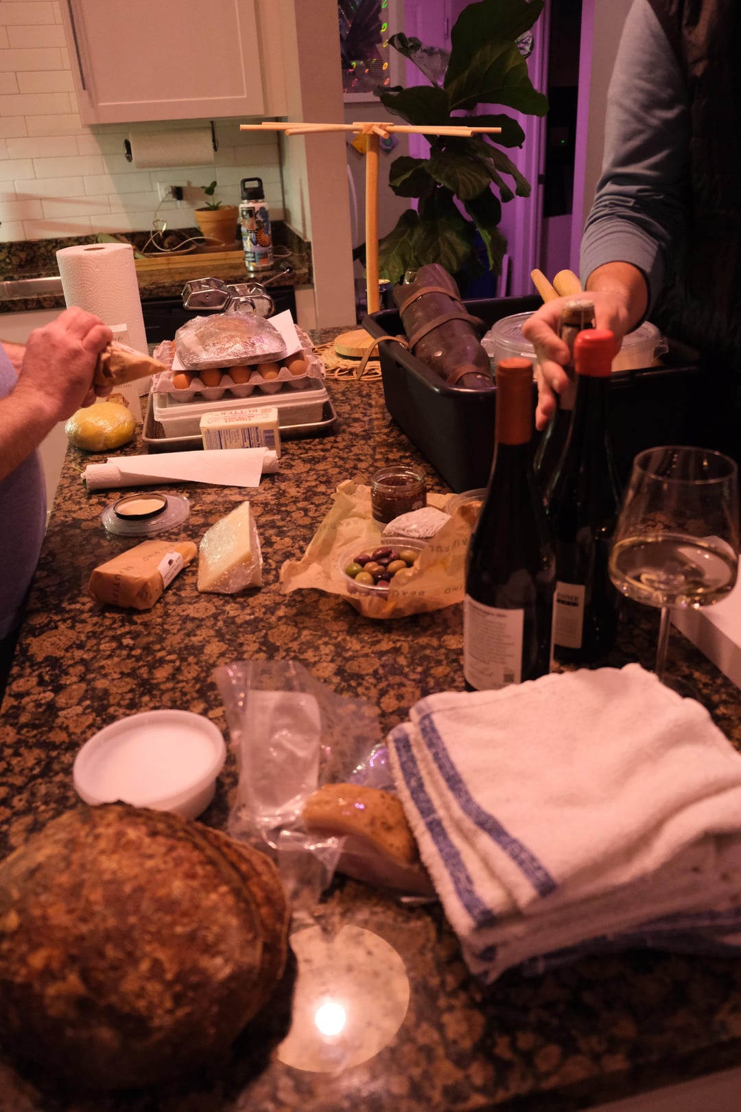 I didn’t know what to expect! Jason showed up with so much stuff – 4 bottles of wine from Giant, cheese and bread from Beautiful Rind, a loaf of sourdough he had made that day, 2 dozen eggs and flour for the pasta, pasta filling, an entire chicken, brussel sprouts, pies, etc etc etc.