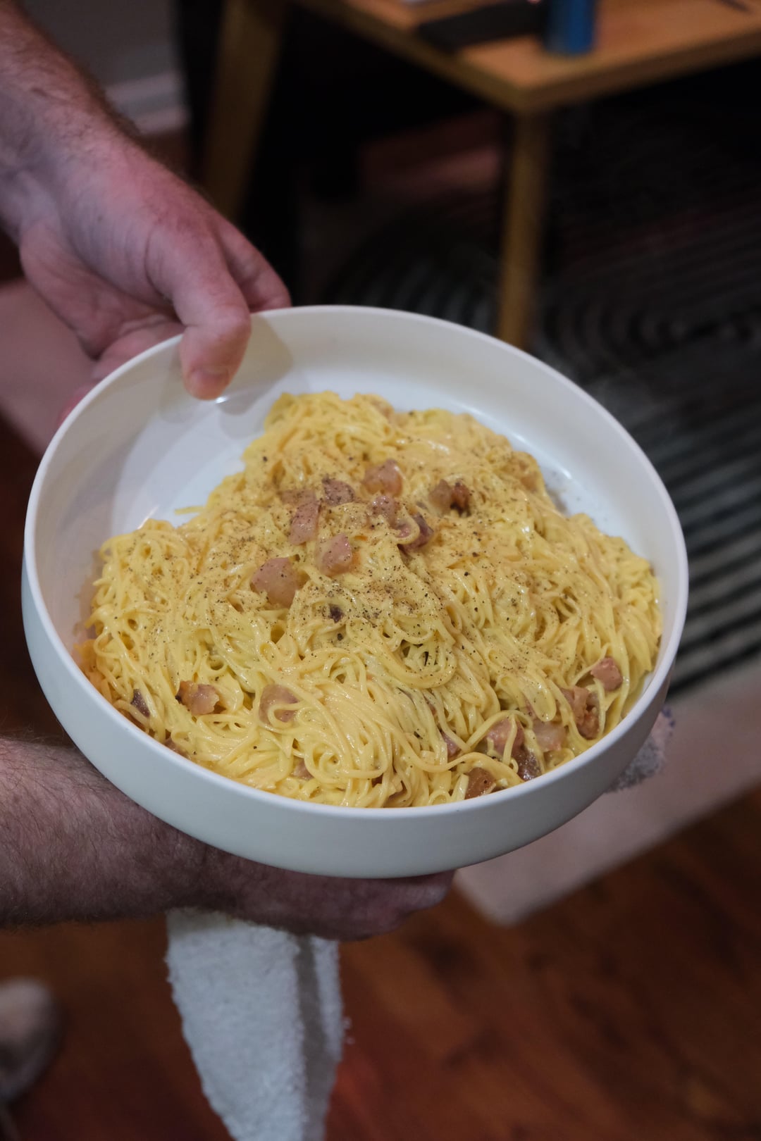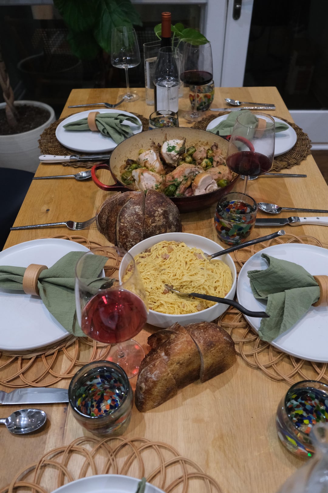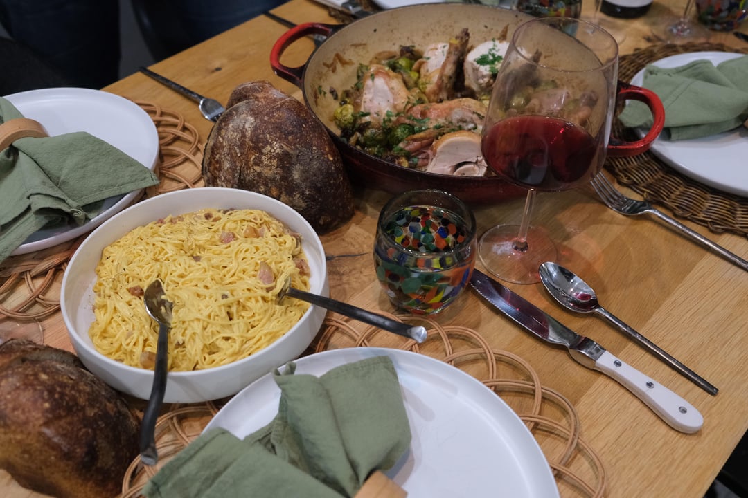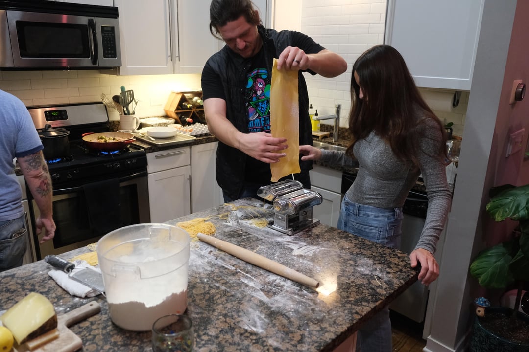 We came with SO many questions about his background, restaurants, experience, cooking techniques, and he took the time to answer them all. He was at our house for nearly 5 hours, staying until 11:30 on a Friday night, effortlessly preparing a gorgeous meal of roast chicken, brussels sprouts, and a carbonara while simultaneously giving us a hands on pasta course. That was one of the coolest things – we barely even noticed that he was cooking this entire meal while we made our pasta. Totally effortless, even in an unfamiliar kitchen.