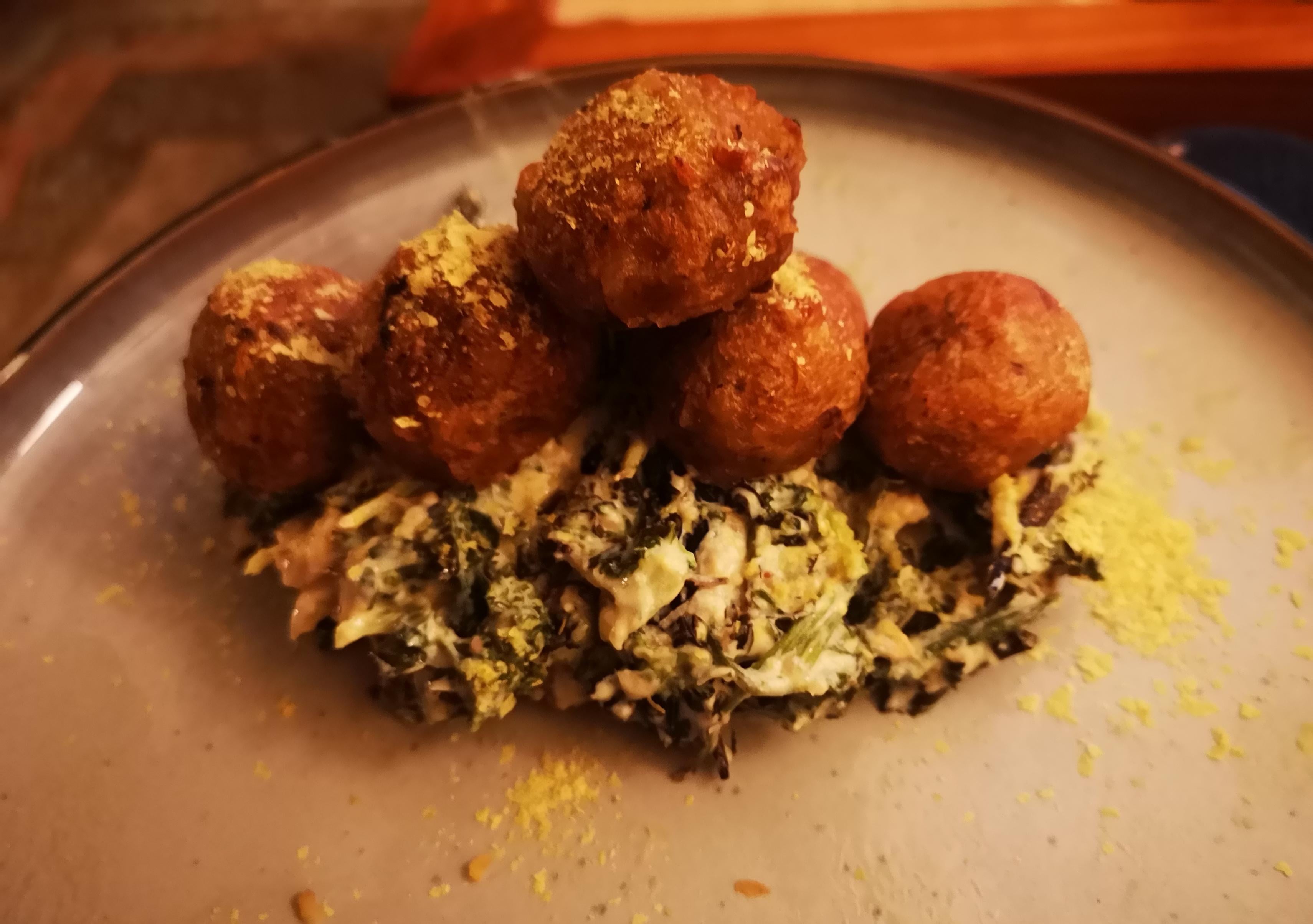 Gnocchi made with mashed roast pumpkin and potato, flour, and oil from an old jar of sun dried tomatoes. Boiled then air fried with more SDT oil.