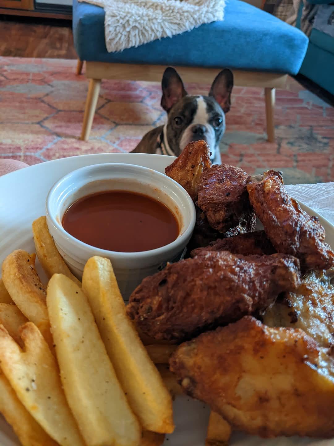 When the wings look so good doggo can’t wait for the bones.