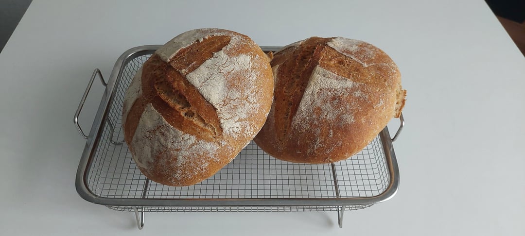 Mix the dough and did 2 folds, 30 min apart, let it rest for 1 hour, then one last fold and shaped it and put into bowls for proofing, proofed for about 30 min and baked it at ~200°C. 15min with steam, the rest if the baking in dry oven Then allowed to cool for about 30min.