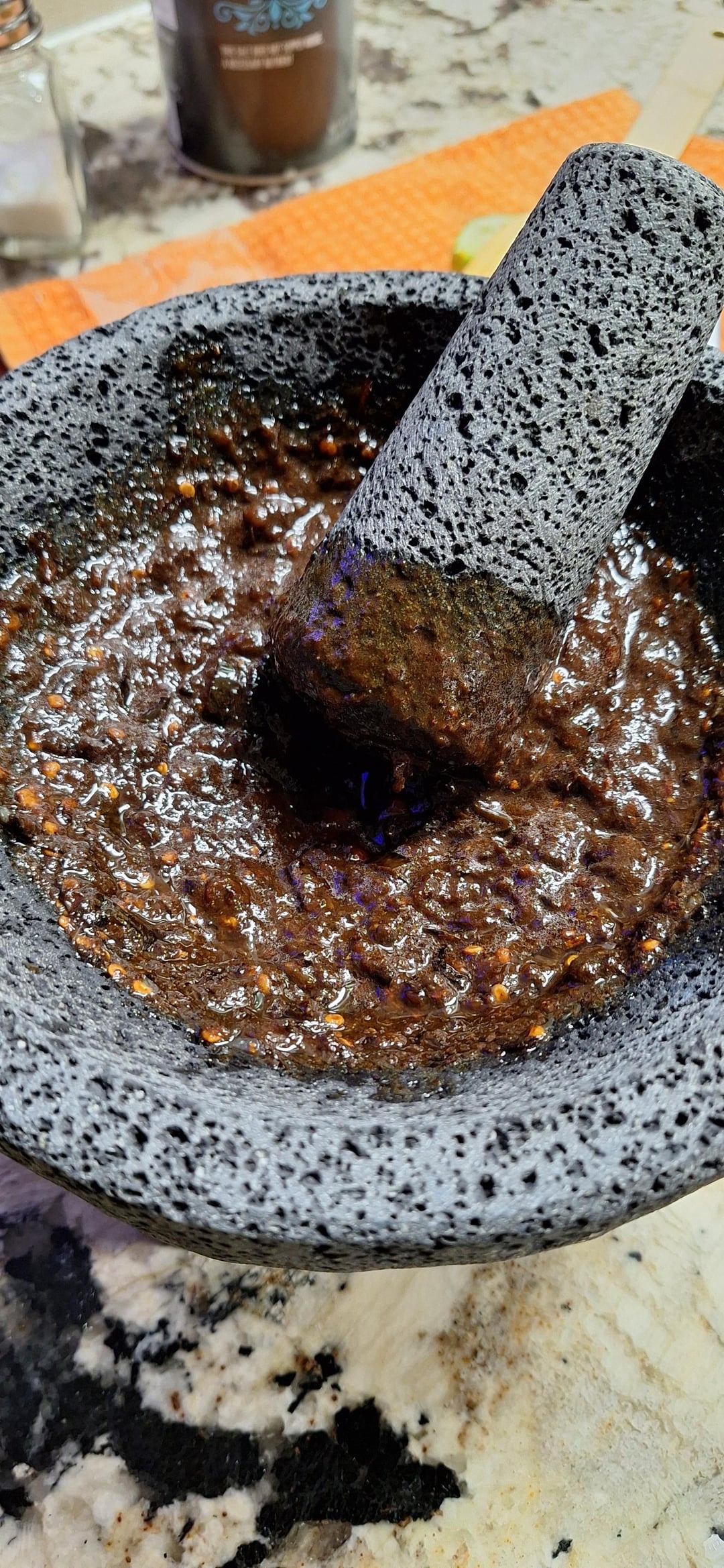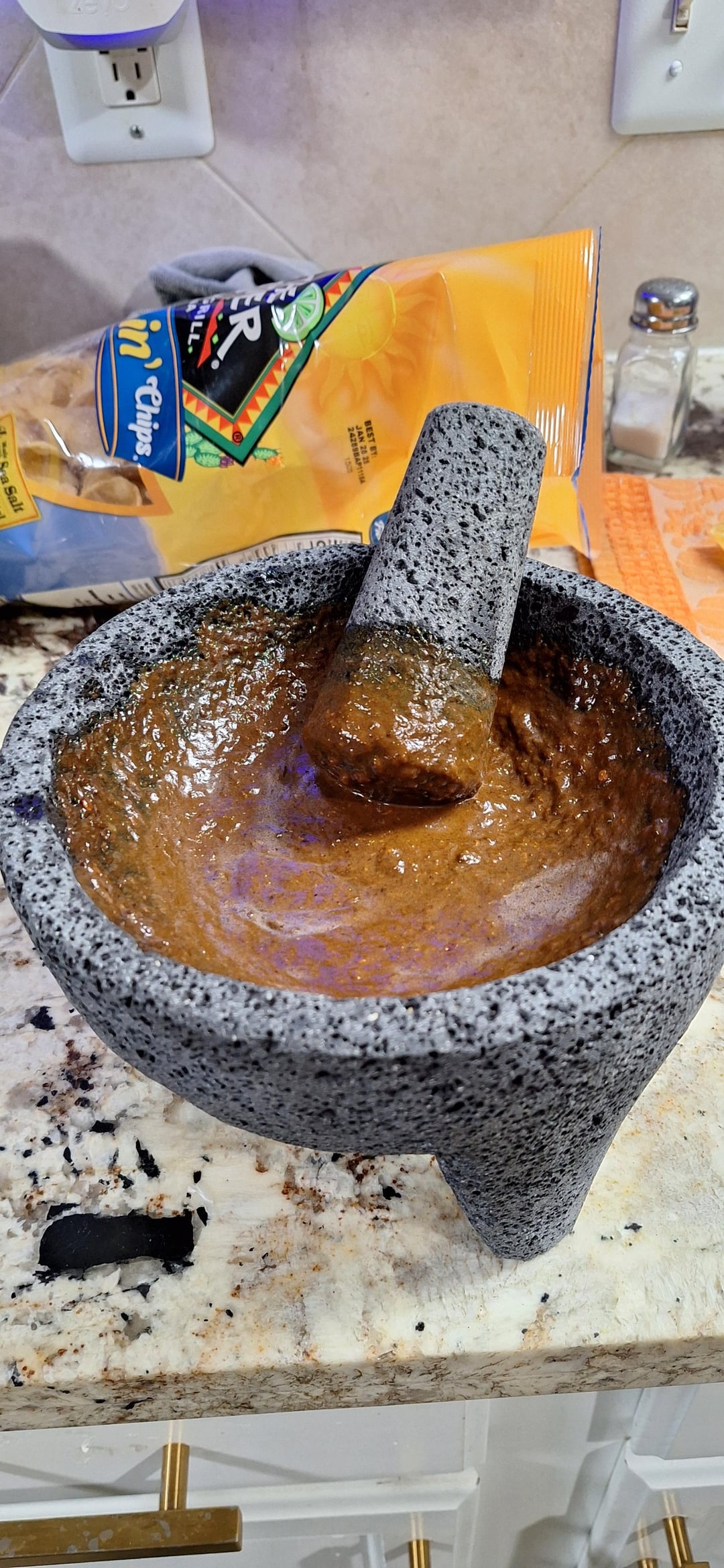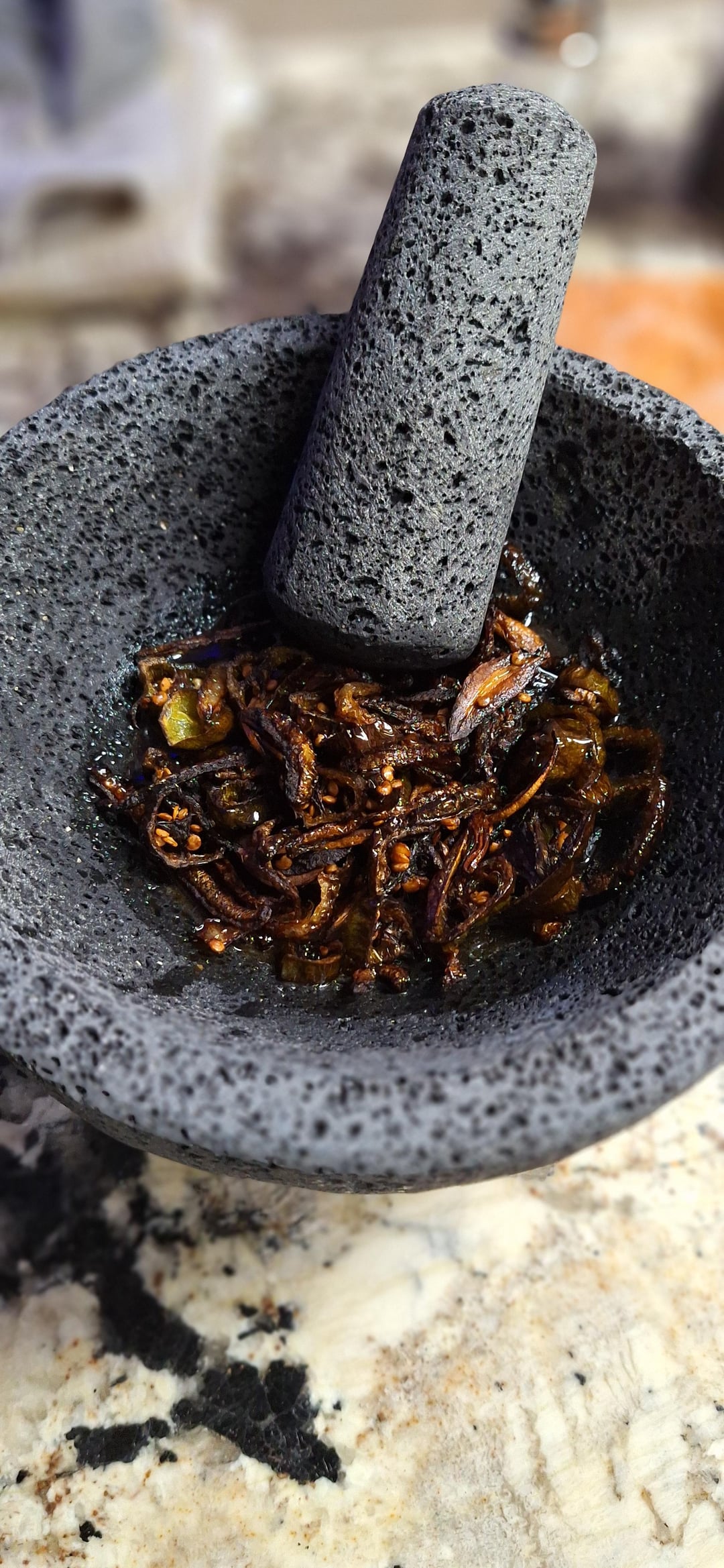 Slice serrano onion and garlic and fry till almost burnt in a pan of cooking oil once nice and fried place ingredients in molcajete (dont add the oil yet) and grind to paste or a nice thick consistency then add lime juice and the soy and w sauce and salt mix until nice smooth texture and enjoy this made a small amount to enjoy with my dinner triple the ingredients to have some for later use went great with nachos also just on its own with chips and some nice cold beers 🍻