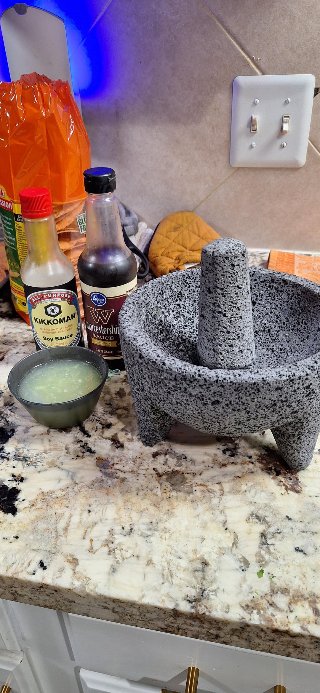 Recipe: 5 serrano 1/2 onion 3 garlic cloves juice of 1-1/2 limes soy sauce (adjust to taste) worcestershire sauce (adjust to taste) 2tsp of salt