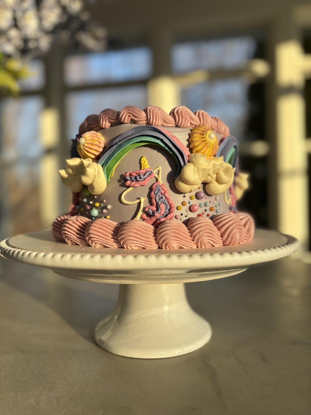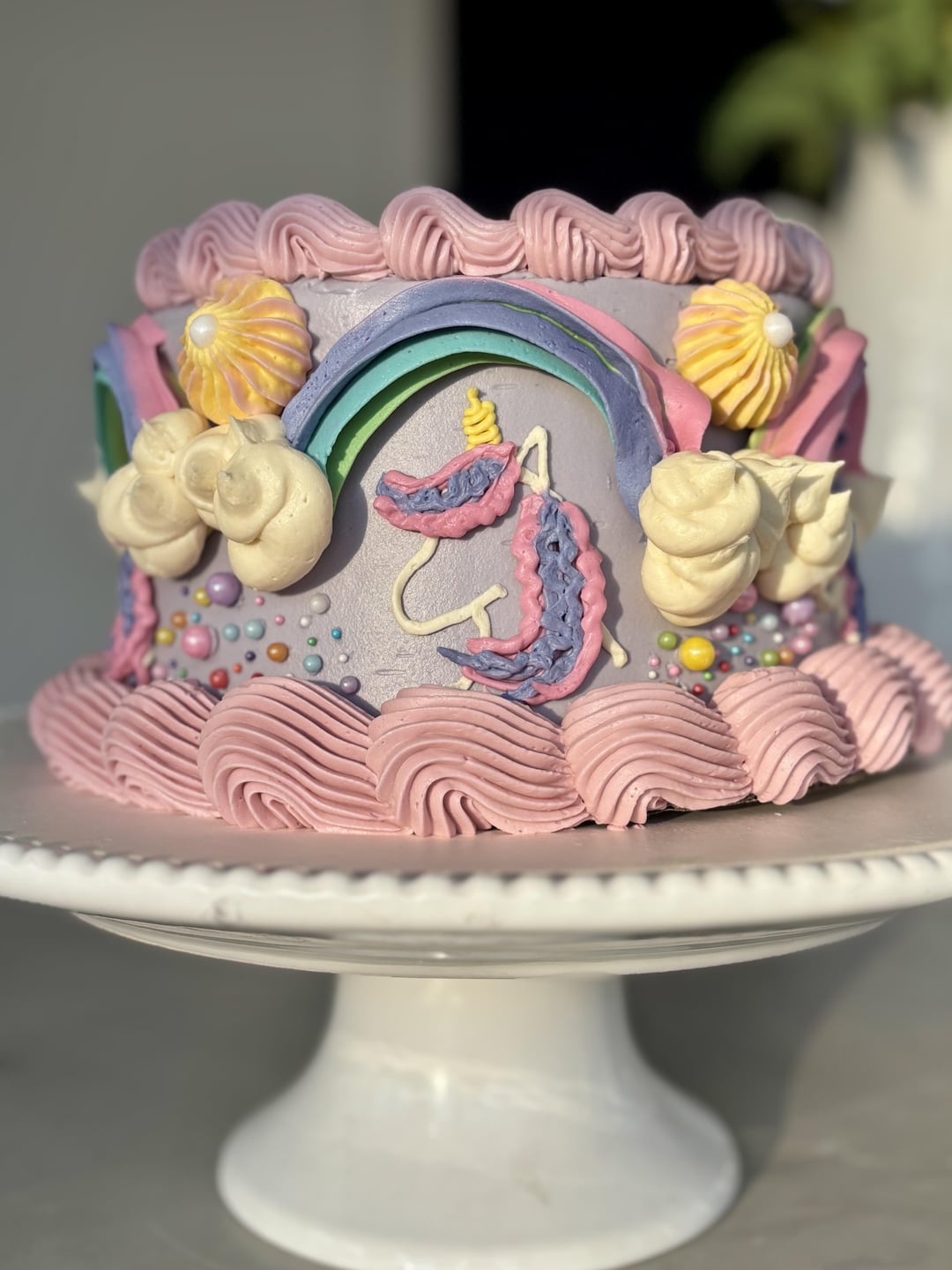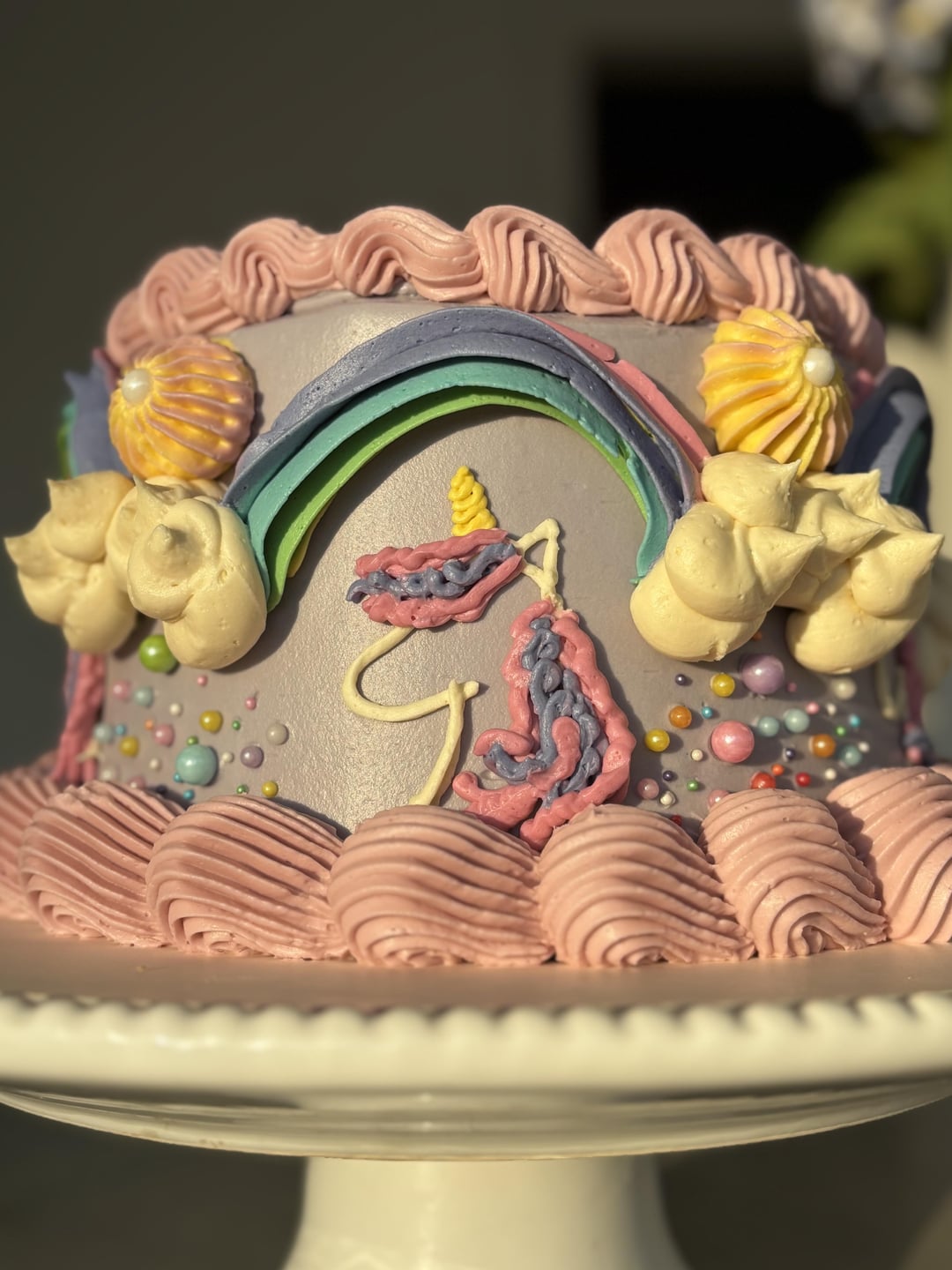 It looked so much better in my head but I still like the idea of it! A taller cake would have worked better I think. Need to work on my piping but hopefully the 4 year old birthday girl loves it 🙂