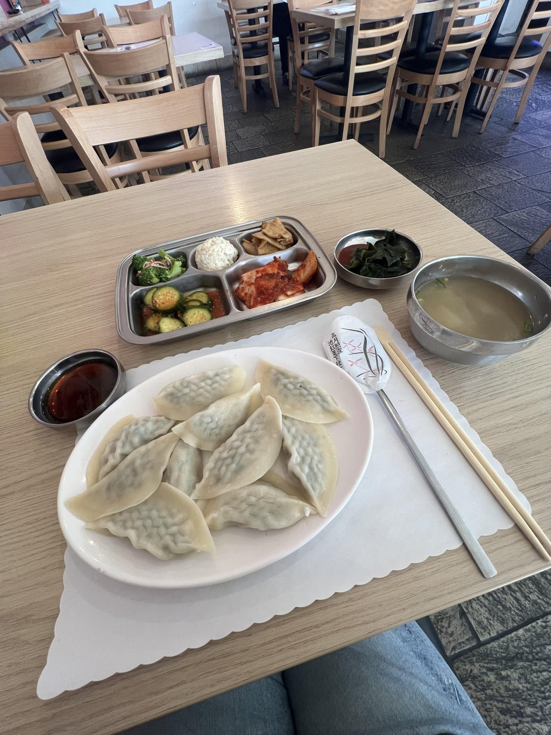 it was 10 steamed pork and spinach dumplings. beef rib for the bibimbap