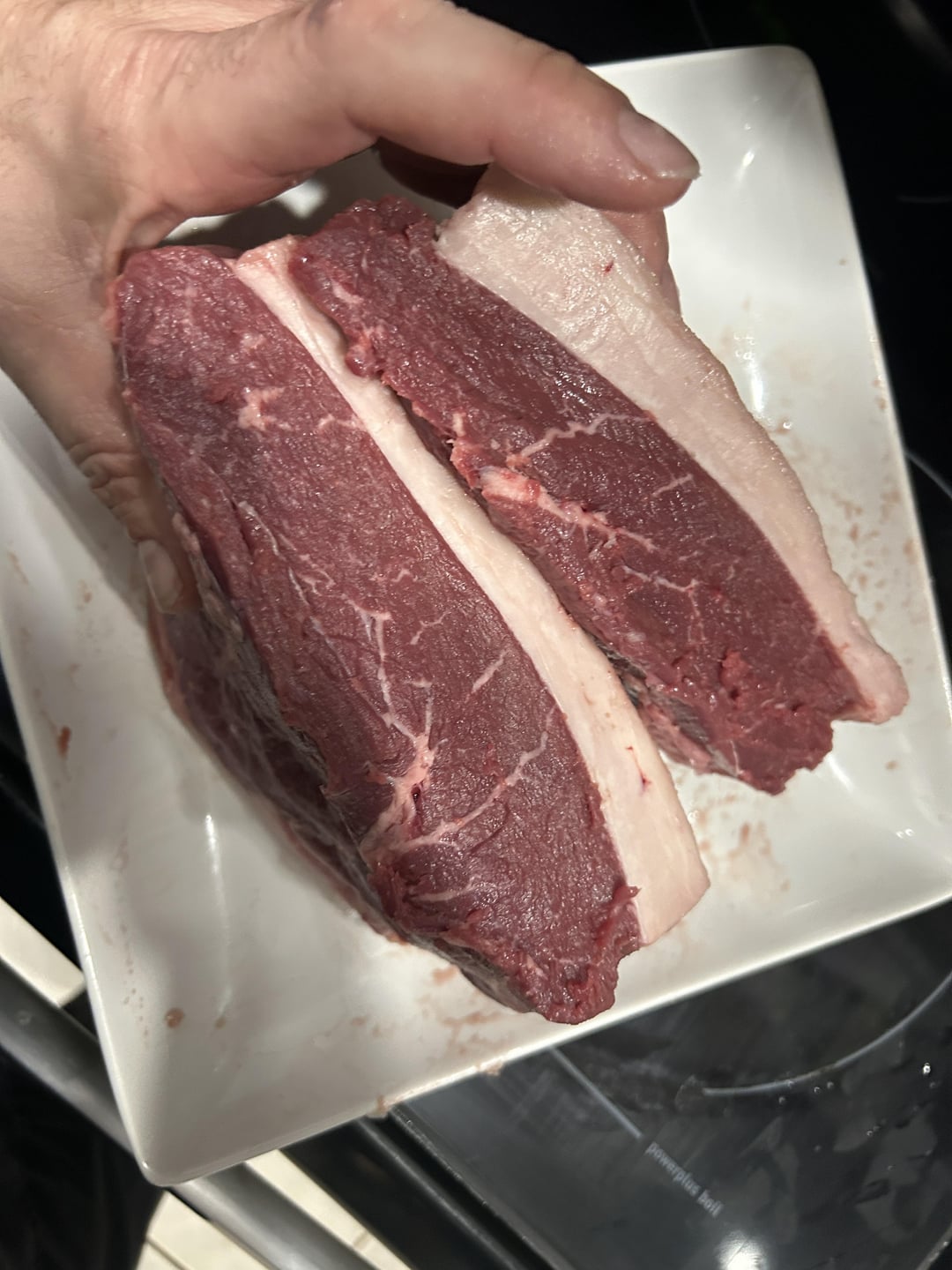 Top sirloin with fat cap. 3.5lbs total. Cut into 2 sections.