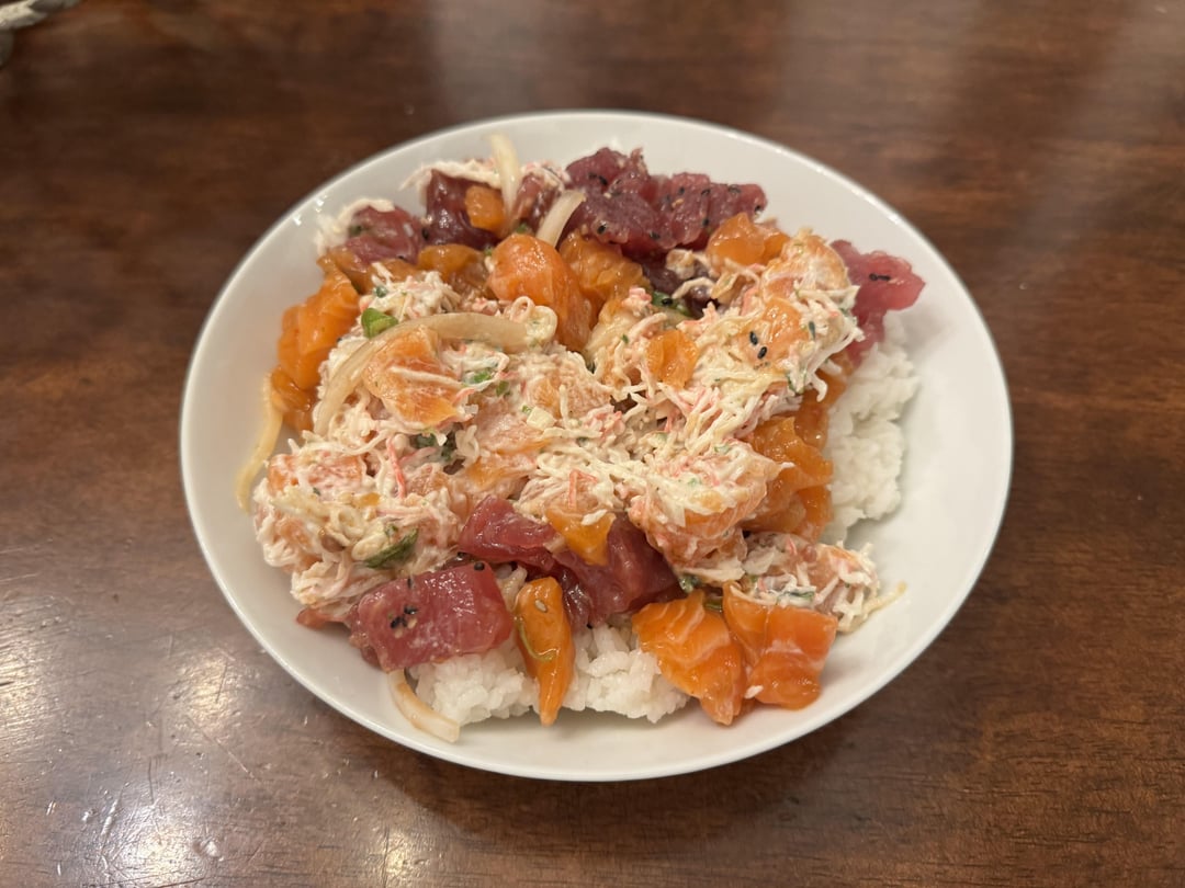 Calories for this 3-Scoop of Protein Poke with two scoops of rice? It was (left to right) Crab w/ Salmon, Sweet and Spicy Salmon, and Shoyu Ahi. I would estimate each rice ball to fit into a 1 cup measuring scoop (at its current size), and each scoop of protein to be around 2/3 cup.