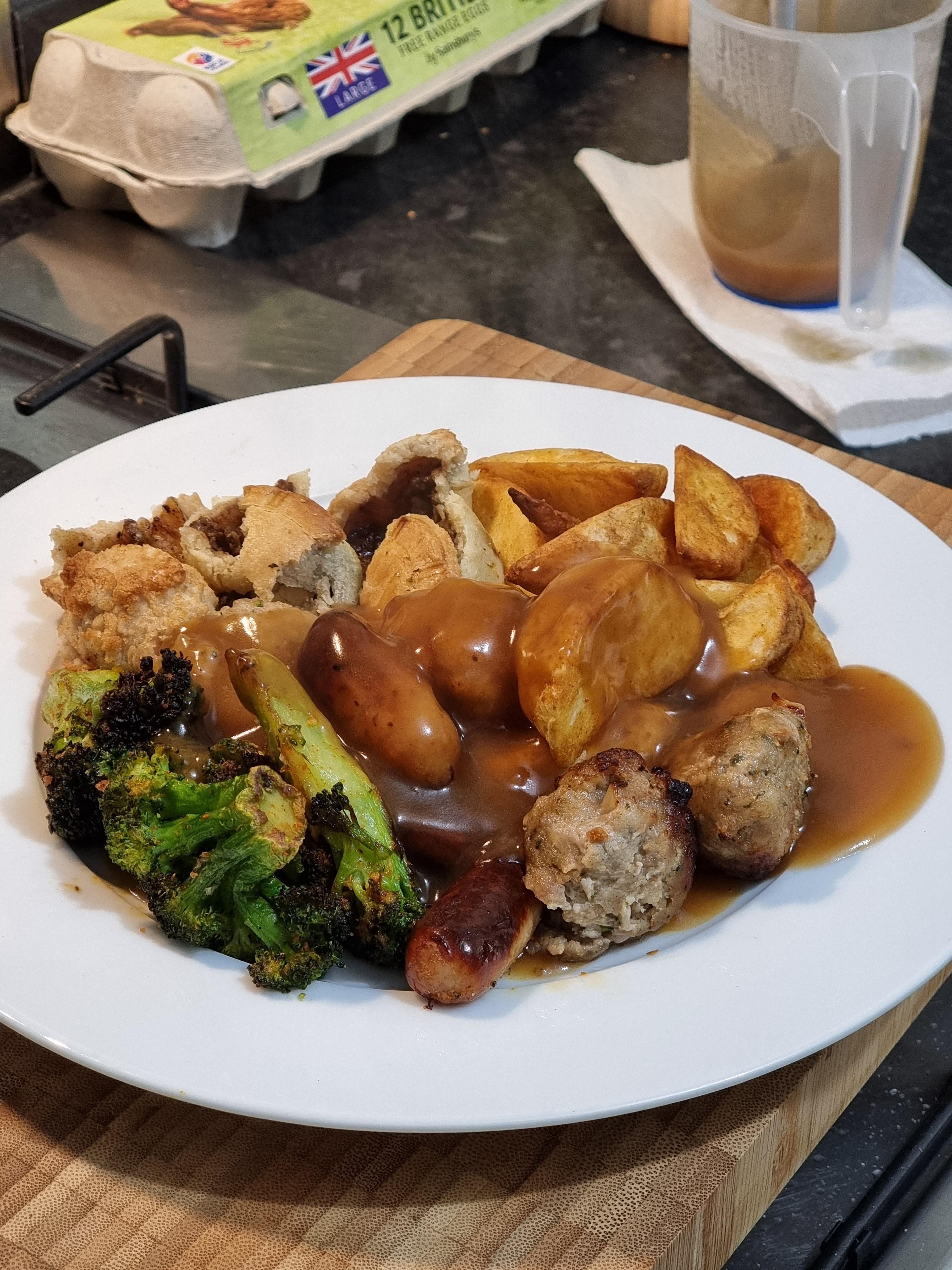 Mini roast potatoes with 2x party size steak pies, 3x pork stuffing balls, 4x cocktail sausages, with parsnips, carrots and brussel sprouts & broccoli.by nathantravis2377 Write A CommentYou must be logged in to post a comment.