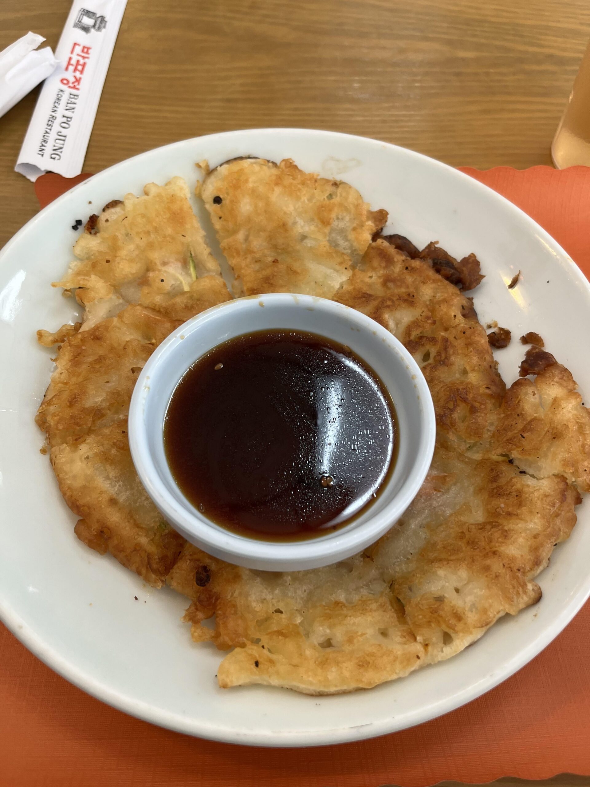 That’s just a little something the owner gives out for free. They call it bindaeteok, but it’s more like his own concoction (IIRC, it has washed kimchi in it). Regular bindaeteok is mostly comprised of mungbeans, and I don’t think that has that much (if any) mungbeans.