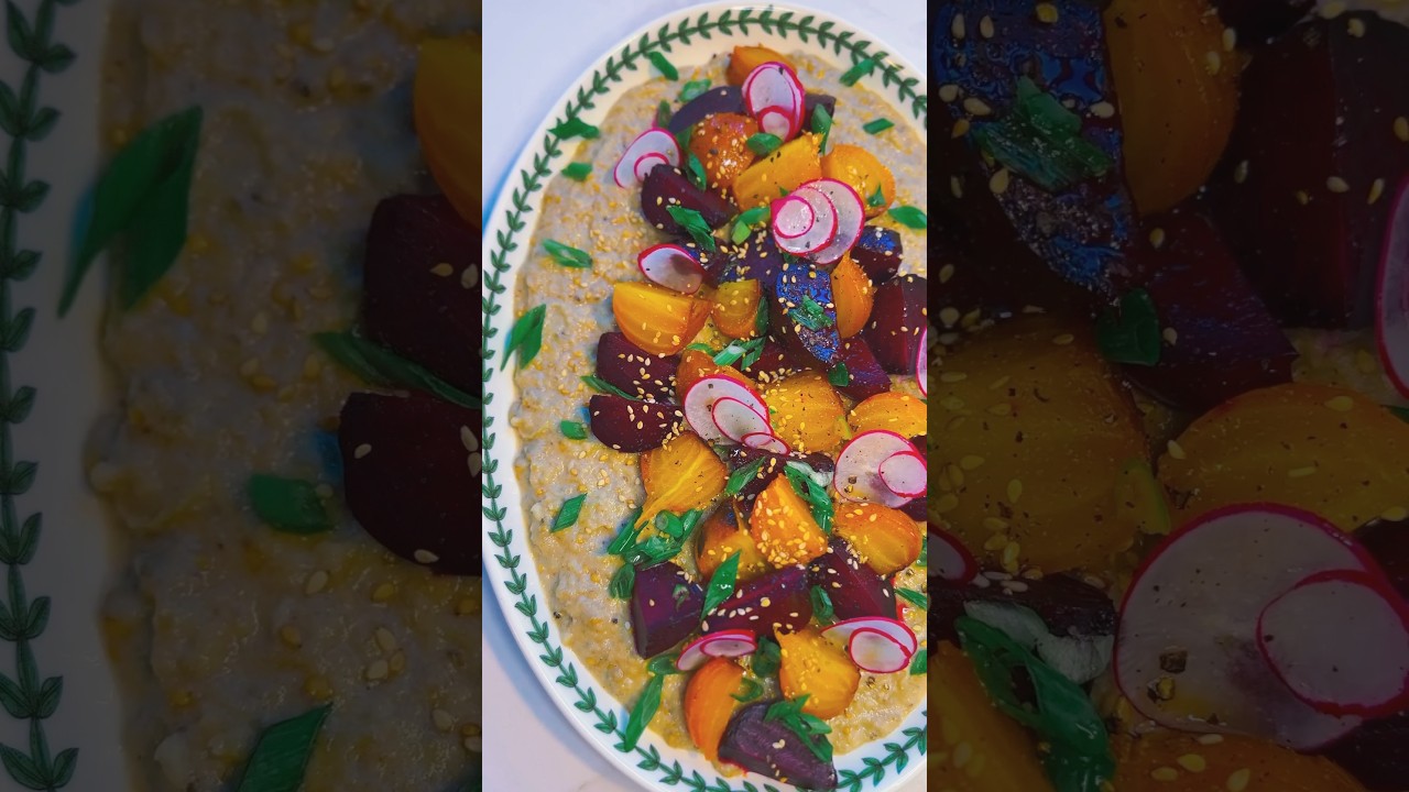 Roast small beetroot until tender (approx 400F for 30 min) cut beetroot into quarters and assemble onto baba ganoush, top with olive or truffle oil, salt, pepper and garnish with sliced radishes and spring onions.