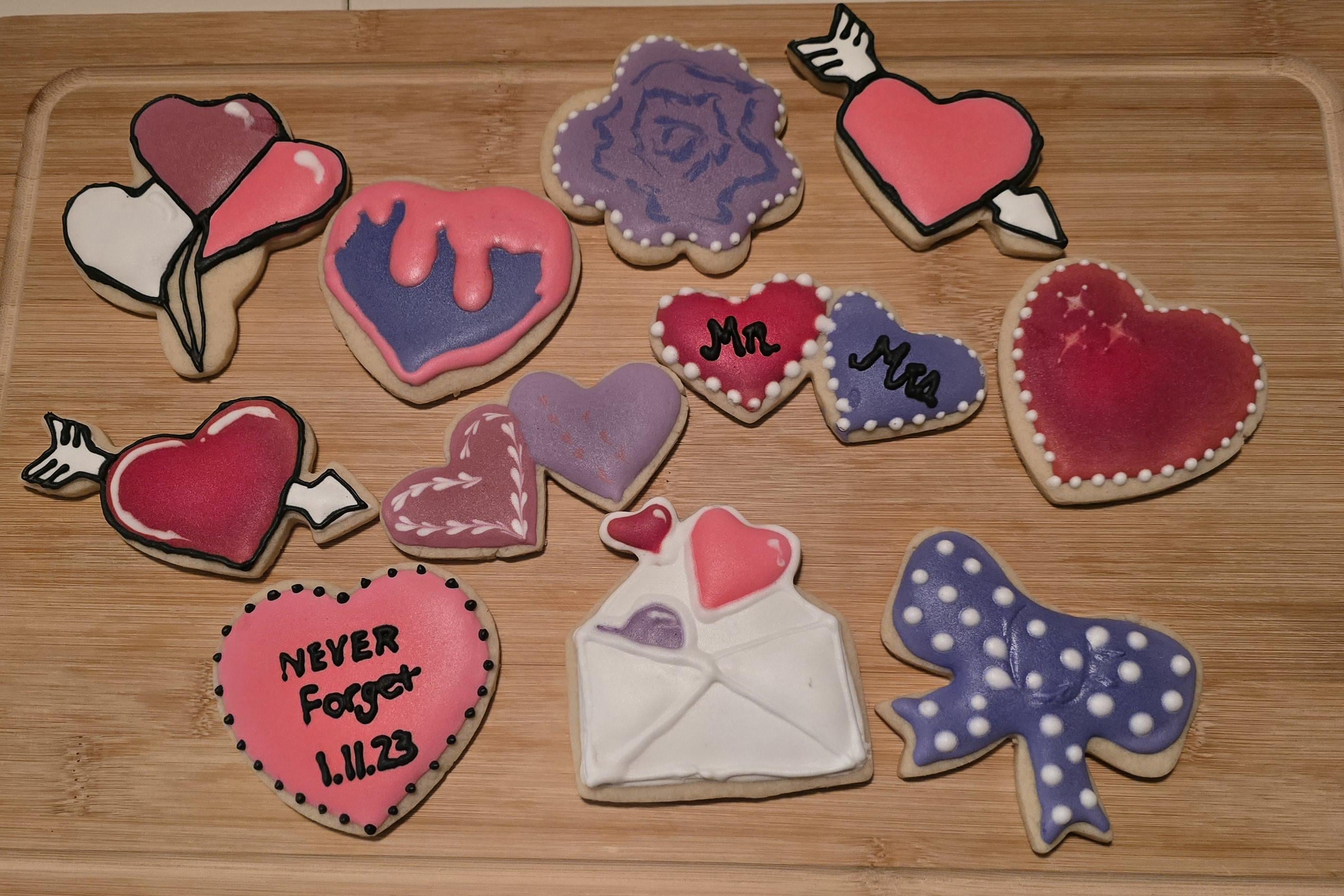 I practiced some Valentine's Cookies today, and my font is awful. I had thickened my royal icing up with a couple tbs of cocoa powder (I read that it would use less black dye that way).