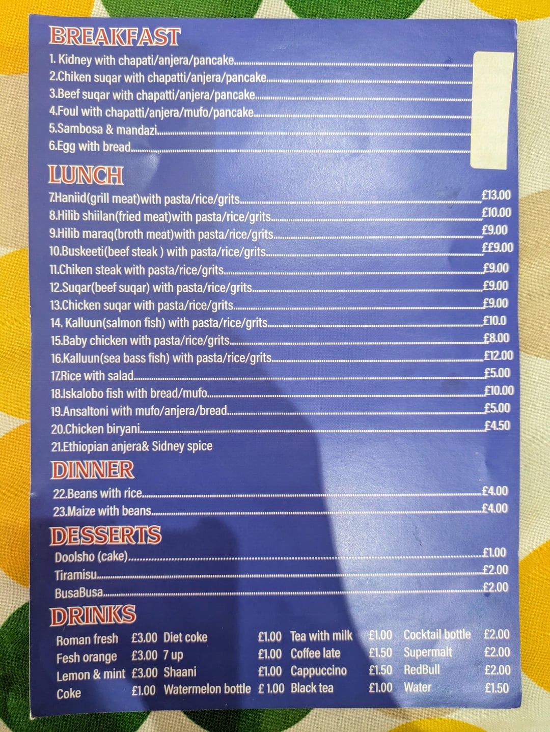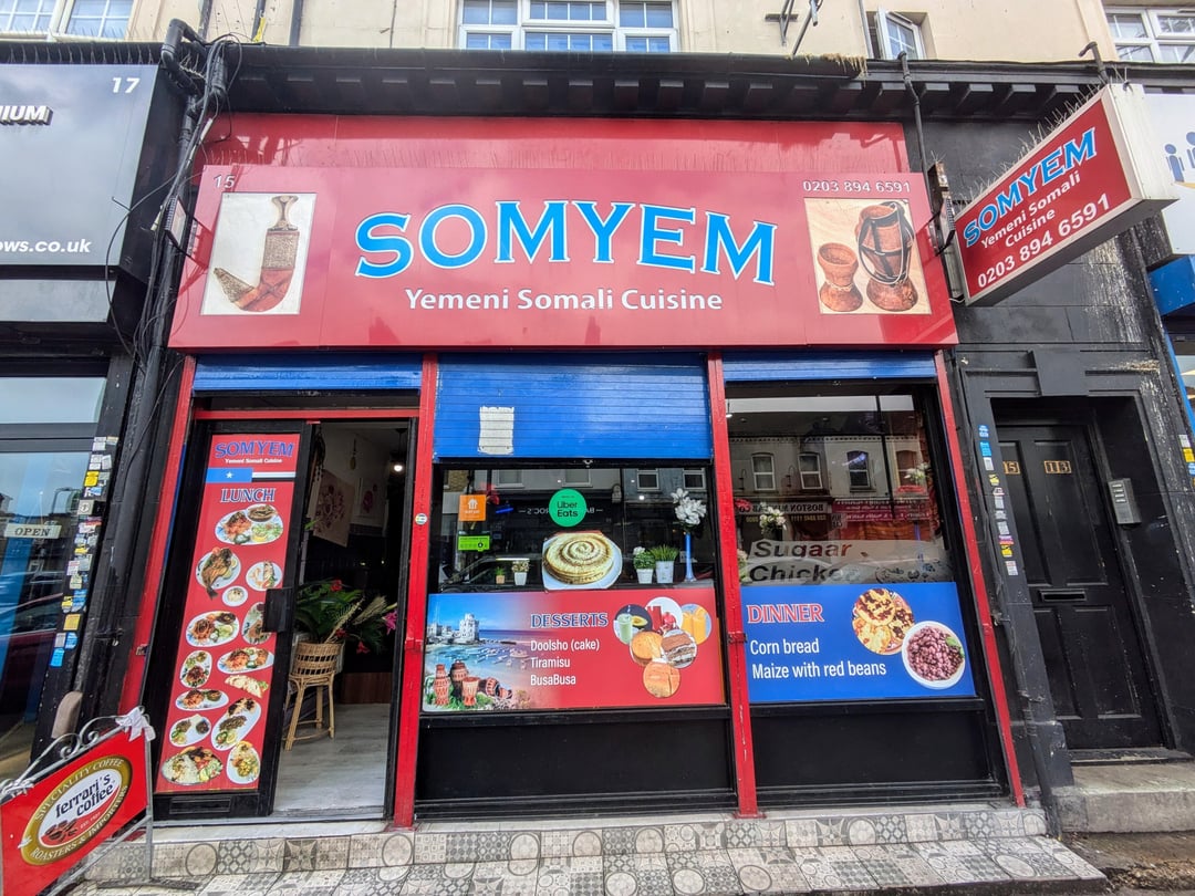 SomYem, in deepest west London (for me, at least, it's W7 and I'm travelling from IG8) was an interesting affair.. The name comes from Somalia and Yemen run together – SomYem. When we turned up it felt like we were walking into and then sitting in someone's front room. An old boy hanging around (maybe the owner?) called me Lord Palmerston and my other half Queen Victoria. To this day we're about 90% confident that that was a compliment. I placated my Irish Republican tendencies with the thought of the food to come (from photo 4 onwards).