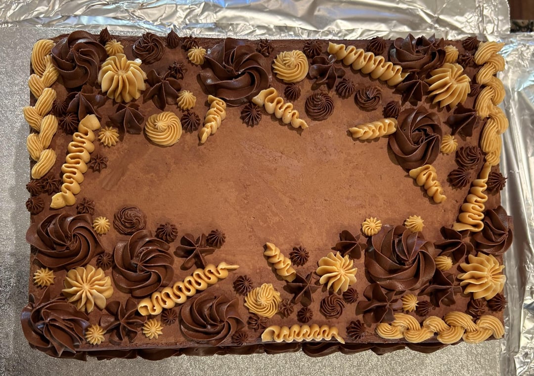 Biggest cake I’ve ever made, for 70 people! Bravetart’s devils food cake and chocolate Swiss meringue buttercream with some added salted caramel, chocolate ganache, and salted caramel buttercream inside. Edible flowers on top.