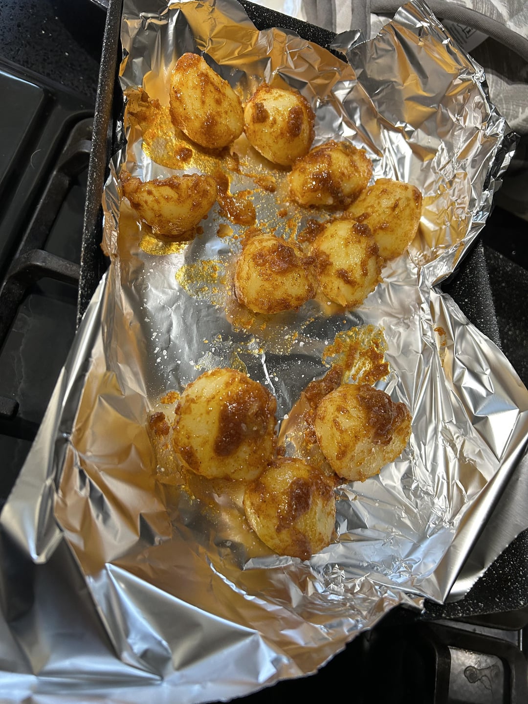 Parboiled the spuds. In a small pan, I heated some beef dripping. Put the spuds in to coat them and then added curry powder to mix with the dripping and spuds. Gas mark 6 for 25 mins before turning and then another 15 mins.by CJC989_G Write A CommentYou must be logged in to post a comment.