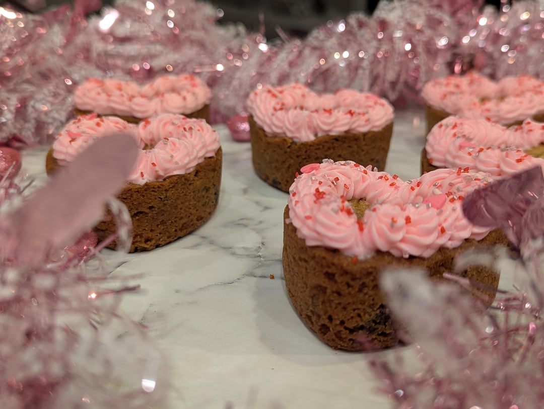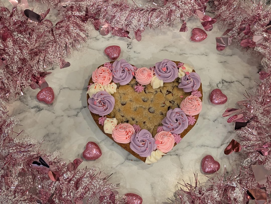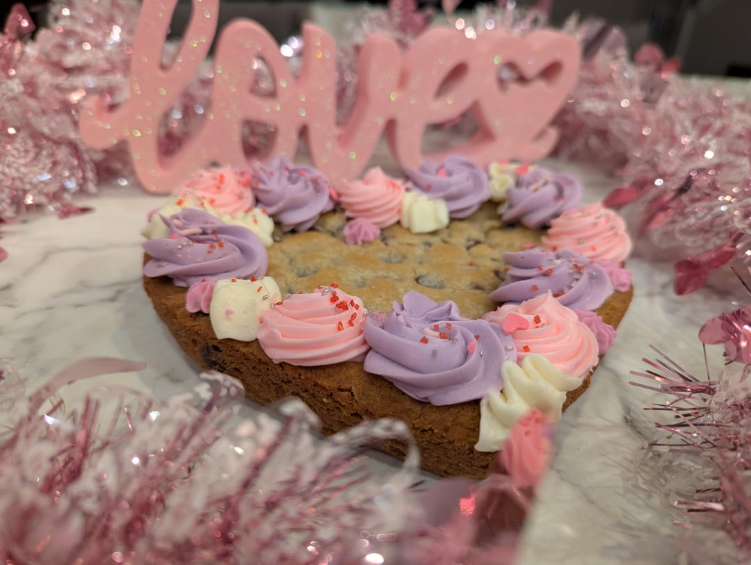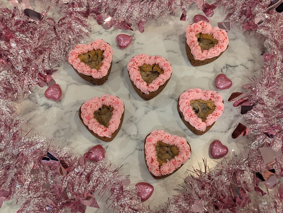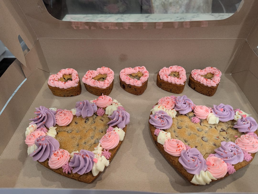 I made these Valentine's inspired cookies yesterday. The cookie cake is 7 inches across and the "deep dish" cookies are 3 inches across. The cookie cakes cost $4.82 each to make and the cookies cost $0.81 each to make. They took me about 4 hours total but I was also trying to entertain my toddler so uninterrupted it would probably take me 2.5 – 3 hours.