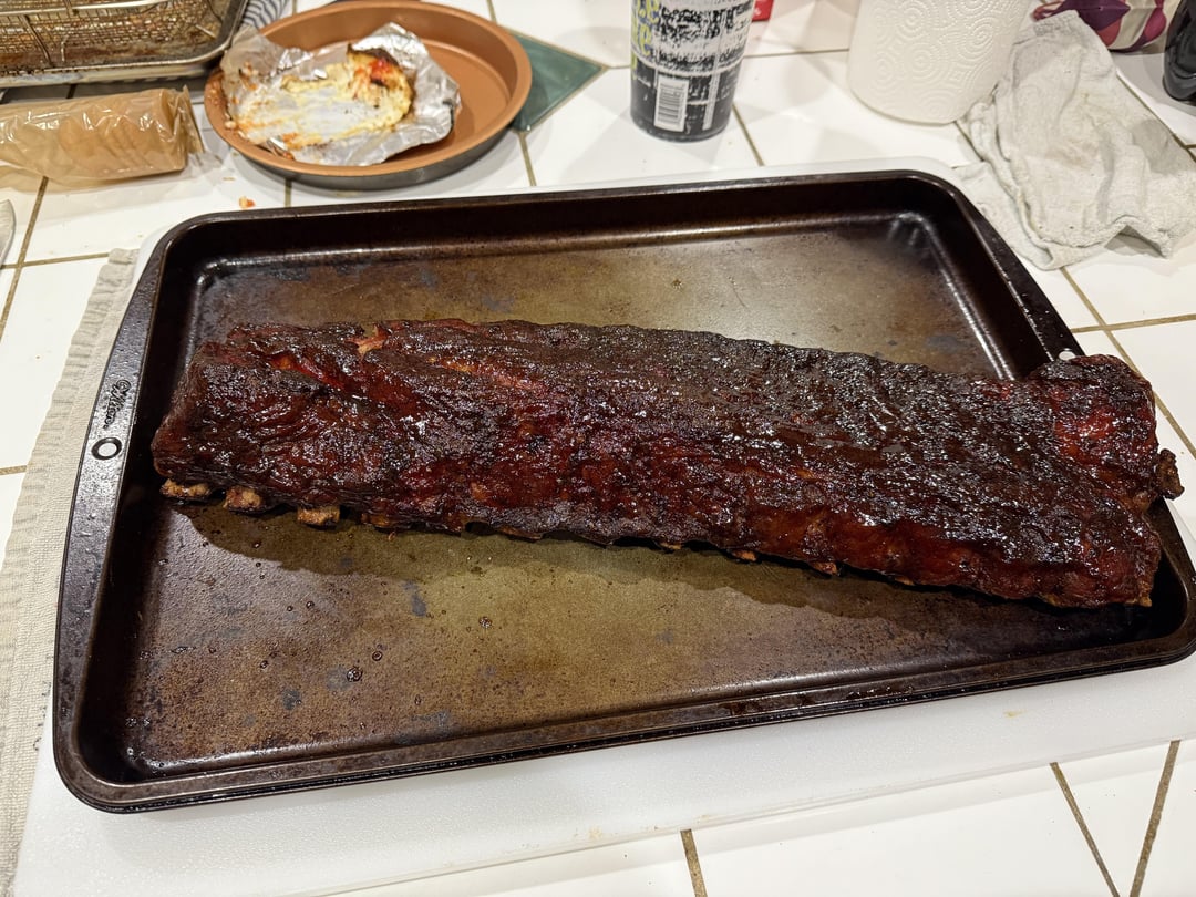 Everything was at 225. Cream cheese for 2:45. No wrap ribs for three hours before spritzing with apple juice/ACV every 45 mins. Sauced two racks with blues hog and one with kinders bourbon peach bbq. Pork belly for three hours before transferring to an aluminum pan with butter brown sugar hot honey and meat church honey hog. 2 hours in the pan then onto a wire rack at 475 for ten minutes.