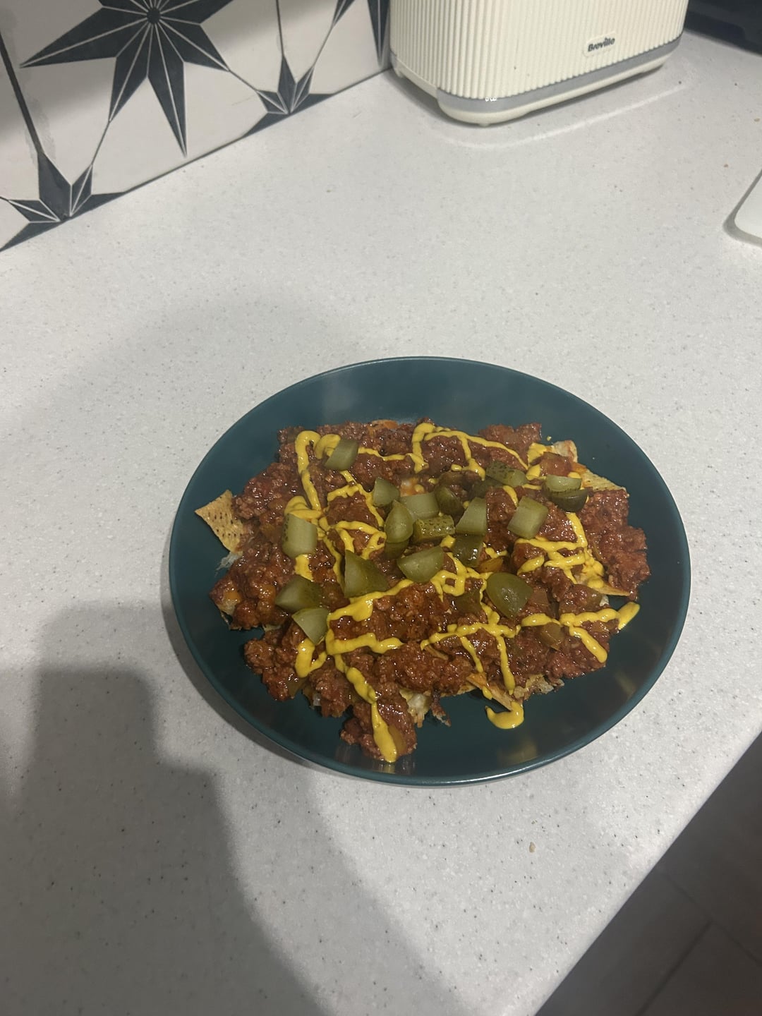 Served over some tortilla chips and melted mozzarella. Topped with chilli pickles and mustard.