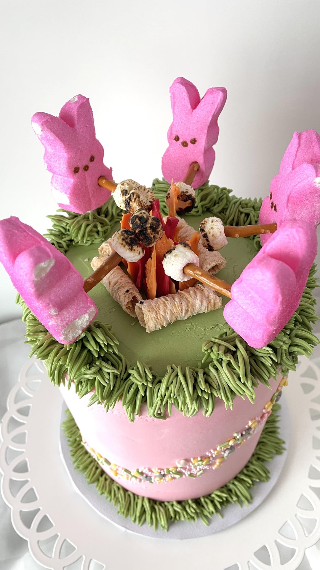 This is a 6” vanilla and chocolate cake with vanilla Swiss buttercream. The flames are candy melts, logs are coconut wafer rolled cookies, and Peeps with mini marshmallows on pretzels rods.