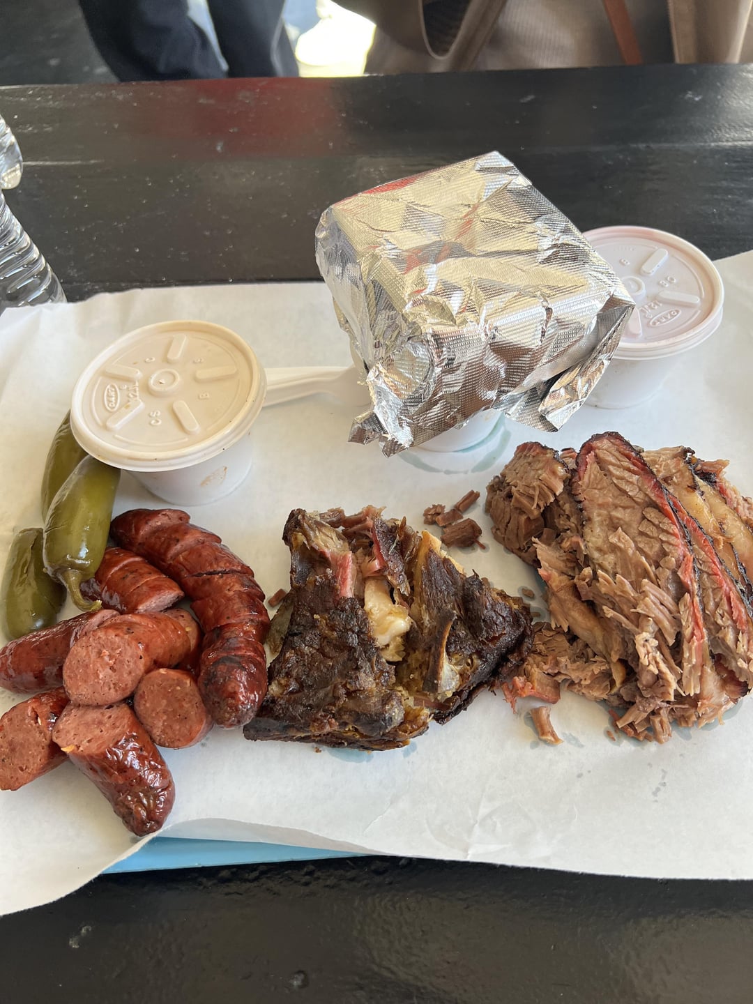 3/4 lb brisket, 1/2 lb mutton, 3 sausage links, mac and cheese, yams, jalapeños and water. $47. It’s not craft barbecue, but it is OG Austin barbecue and cheap enough to take the entire family.