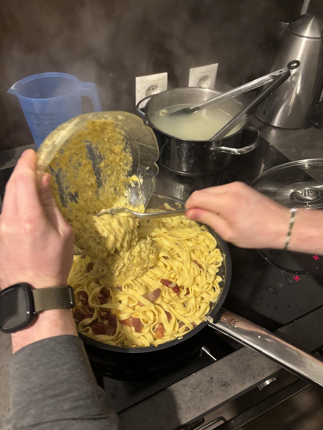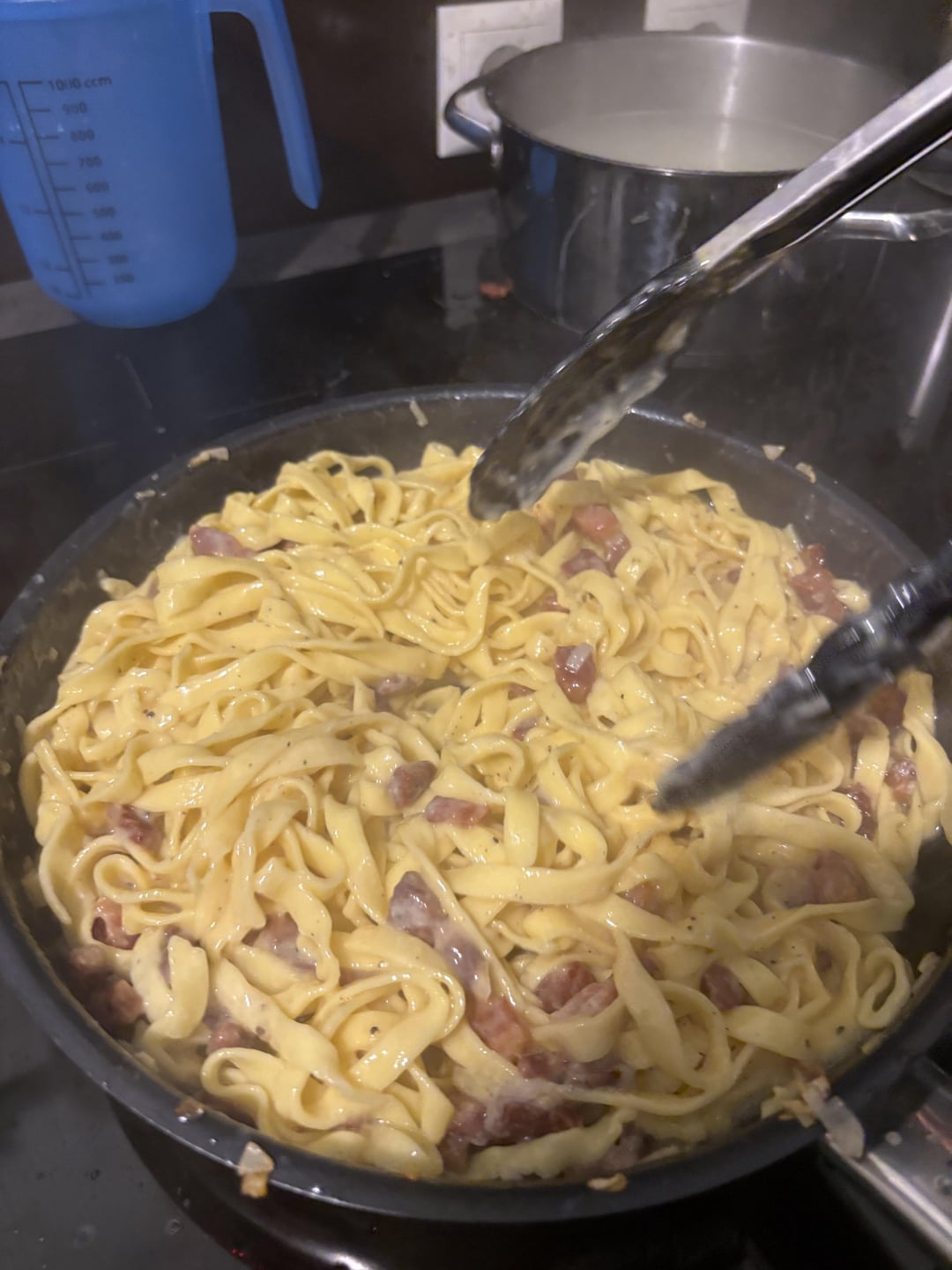 Looking great, even tho, fresh pasta is not realy a good idea for carbonara.