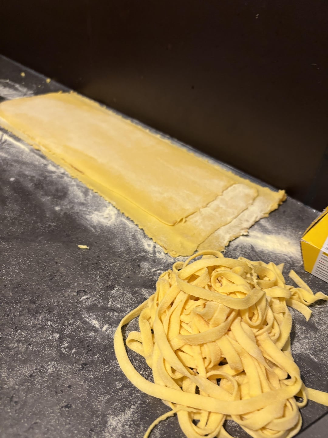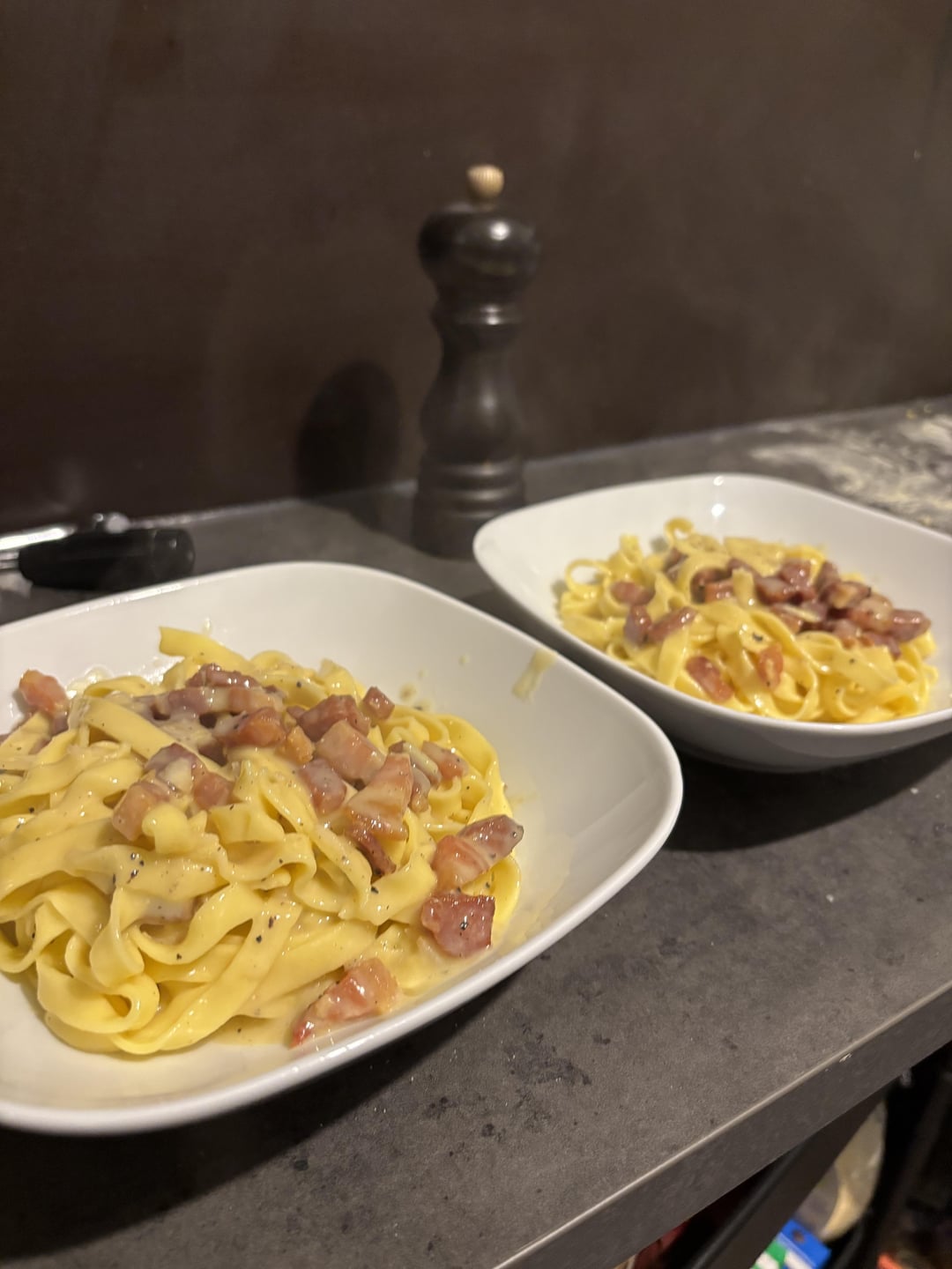 It looks great, just an advice, traditionally you don’t use egg pasta with carbonara (cause eggs+eggs can be heavy). You can use normal pasta, or fresh semolina pasta without eggs.