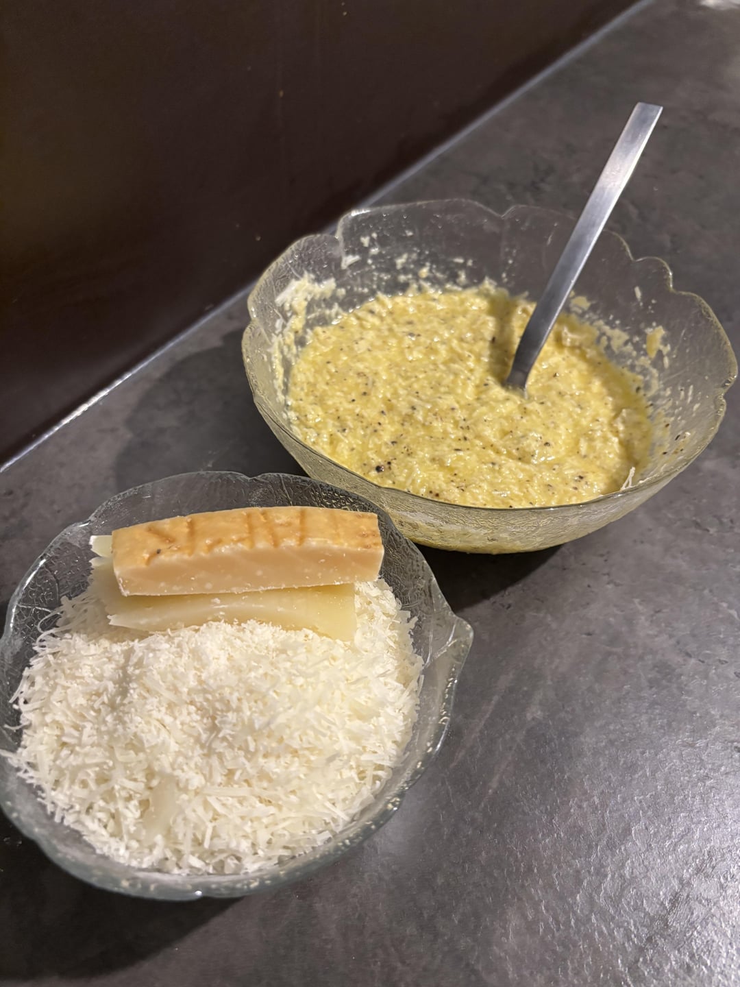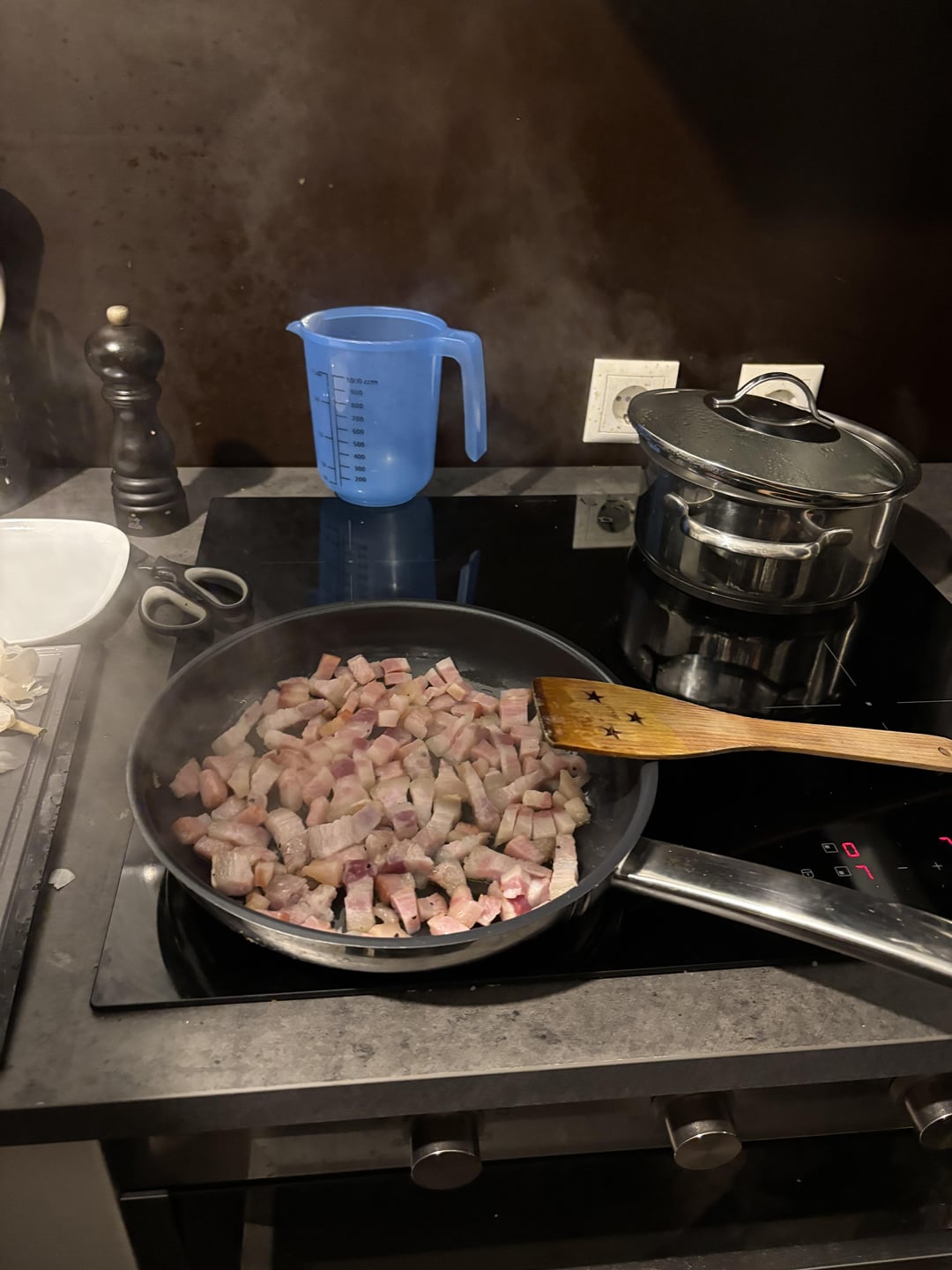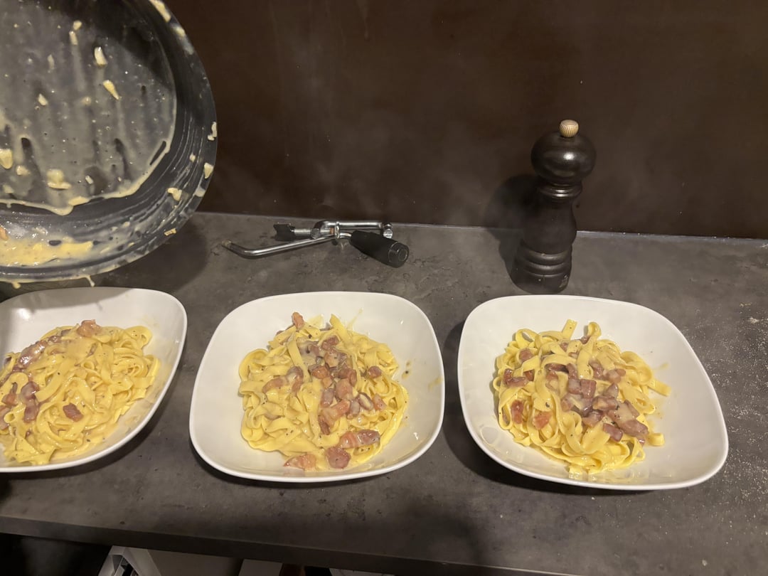 Recipe: Mix 250g Semolina flour, 2 whole eggs, 4 egg yolks until a dough forms (15 min kneeding). Let it rest for half an Hour. In the meantime prepare the Guanciale by cutting it into 1×1 cm squares and cold fry it in a pan. Grate the Pecorino and Parmigiano. Mix the cheese with 2 whole eggs and 2 yolks. Cook the pasta in salted water for 2 – 2,5 min. Put the pasta in the pan with the egg mixture. Stir with a bit pasta water. Serve immediately 🙂