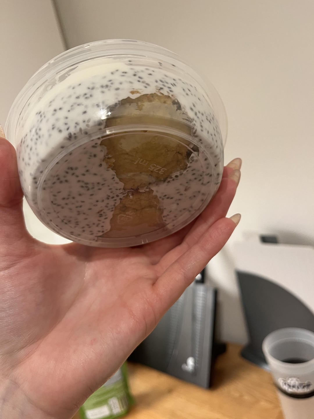 • Topped each with 2 tablespoons of curd mixed with chia seeds, 1 tablespoon of Greek yogurt, some hazelnuts, and a few frozen raspberries.