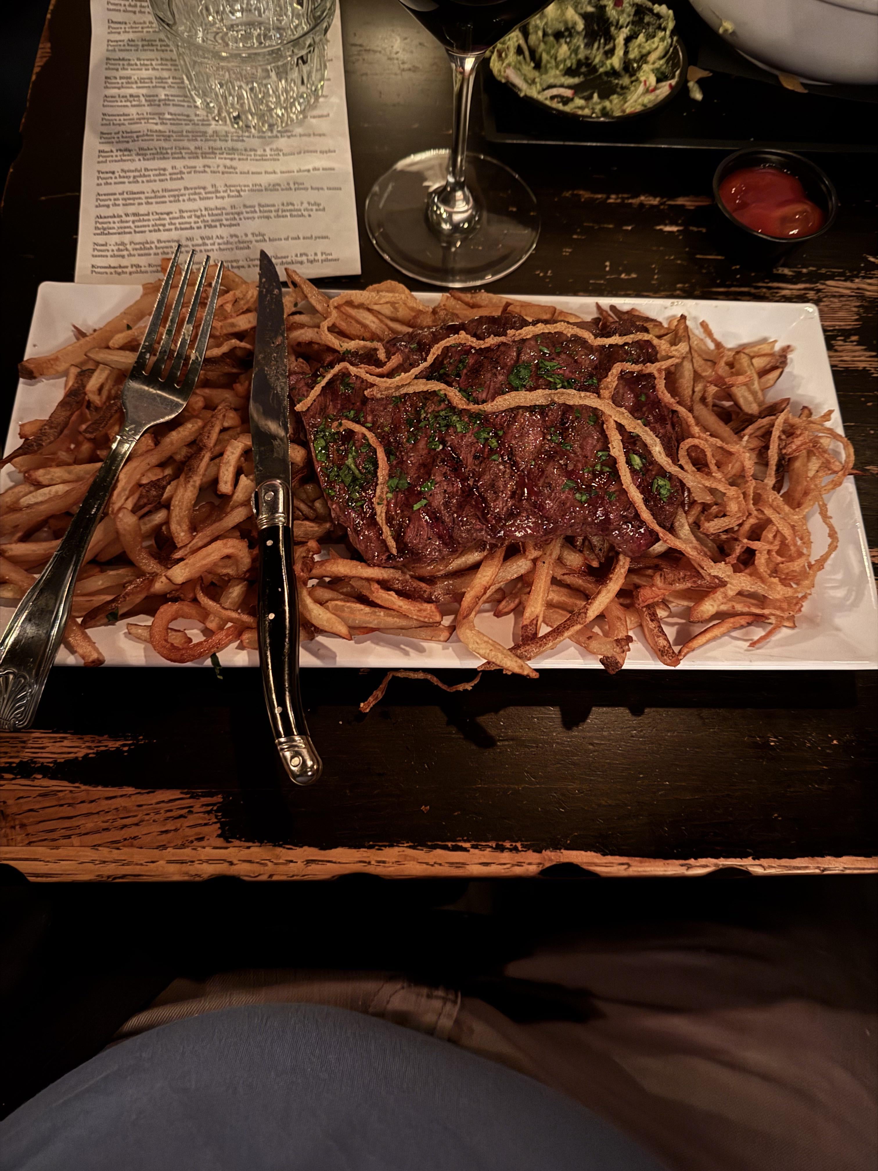 I got the steak frites, which the waitress was kind enough to note that the steak frites comes with a MASSIVE amount of frites (which it did) and encouraged my wife to get another side option (the Mac n cheese was great! Comes with bacon as an option, but for my non-pork eating brethren, the Mac with Breadcrumbs is perfect even w/o the Bacon)