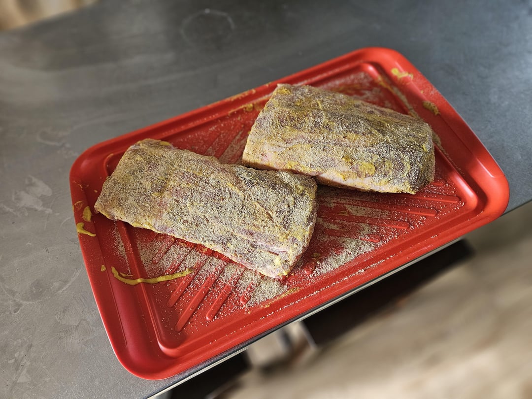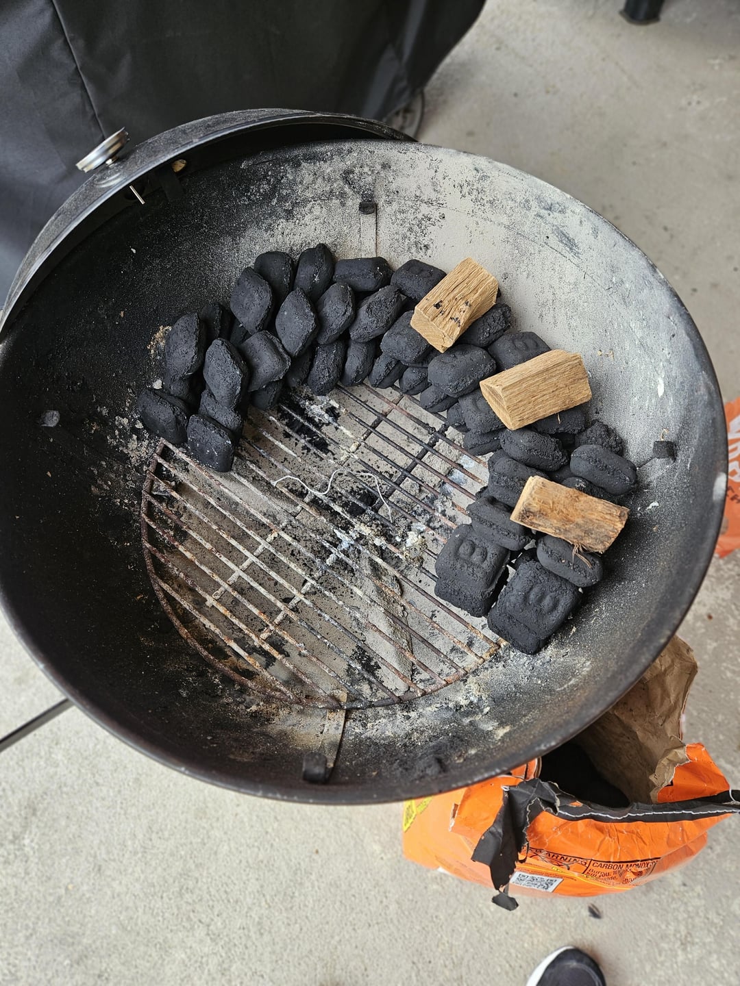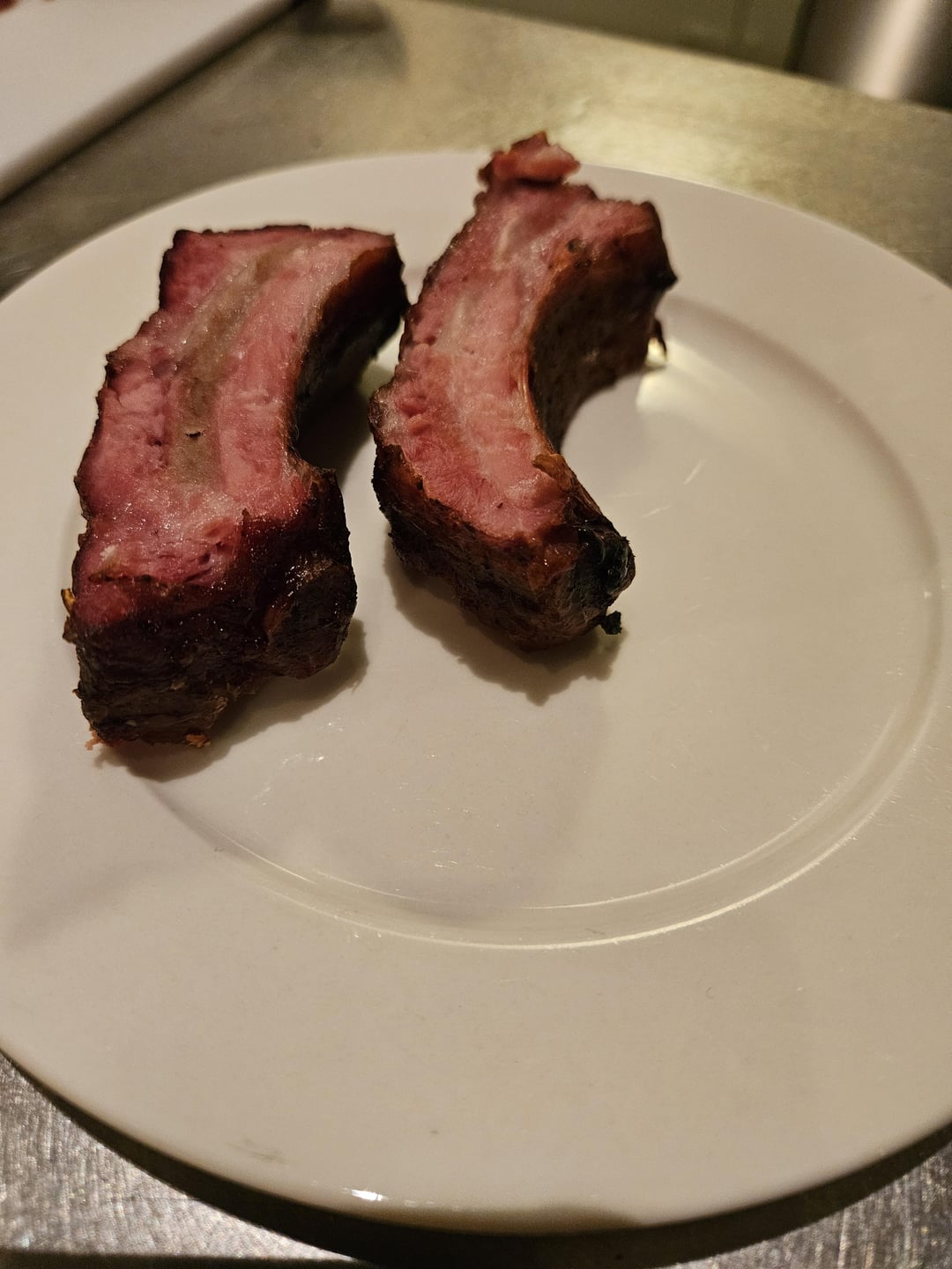 Took me a bit to dial in 250, I'll be more patient next time. Baby backs with Rub Some Butt carolina rub, one rack with Rub Some Butt sauce, B&B briquettes and post oak chunks.