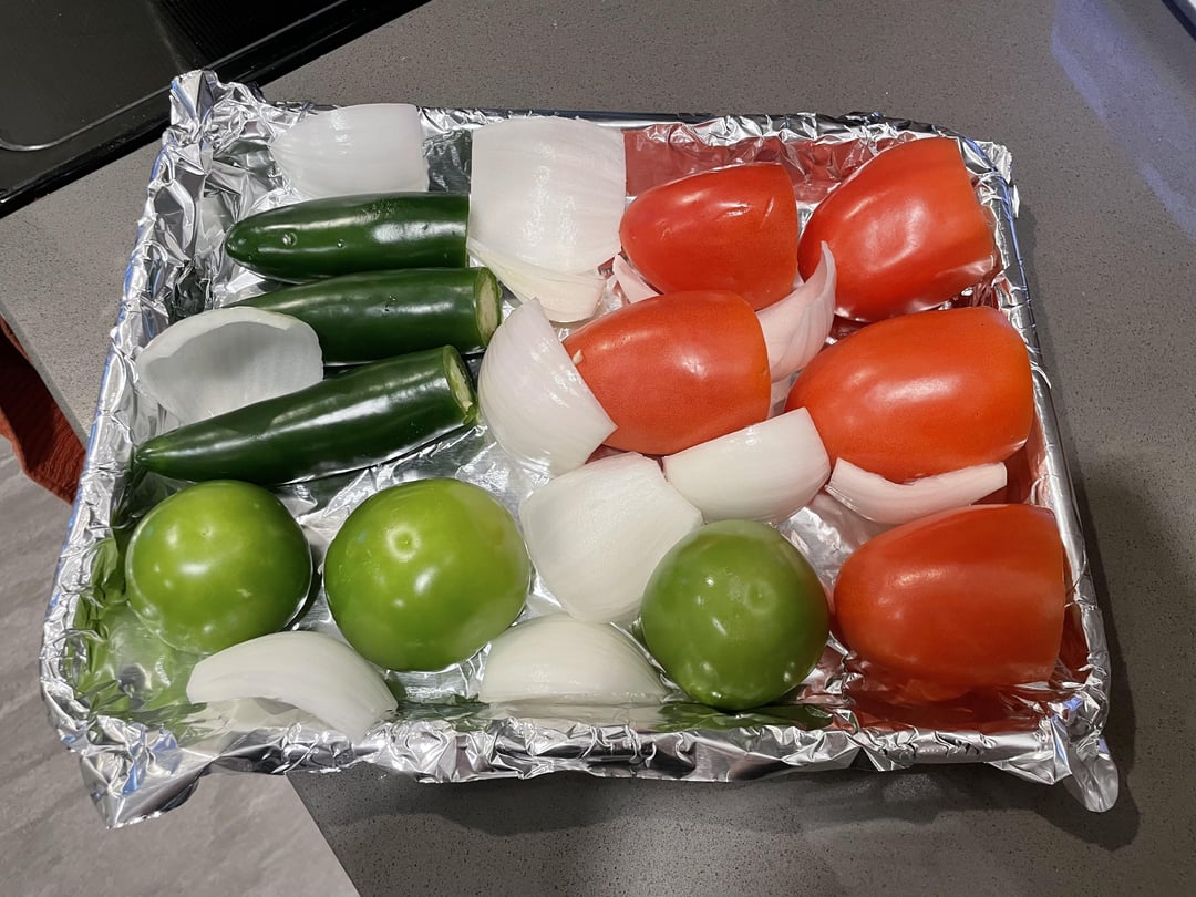 Roasted roma tomatoes, tomatillos, jalapeños and white onion (should have taken a picture after!). Then blended with lime juice, fresh garlic, cilantro, chicken boullion and salt.