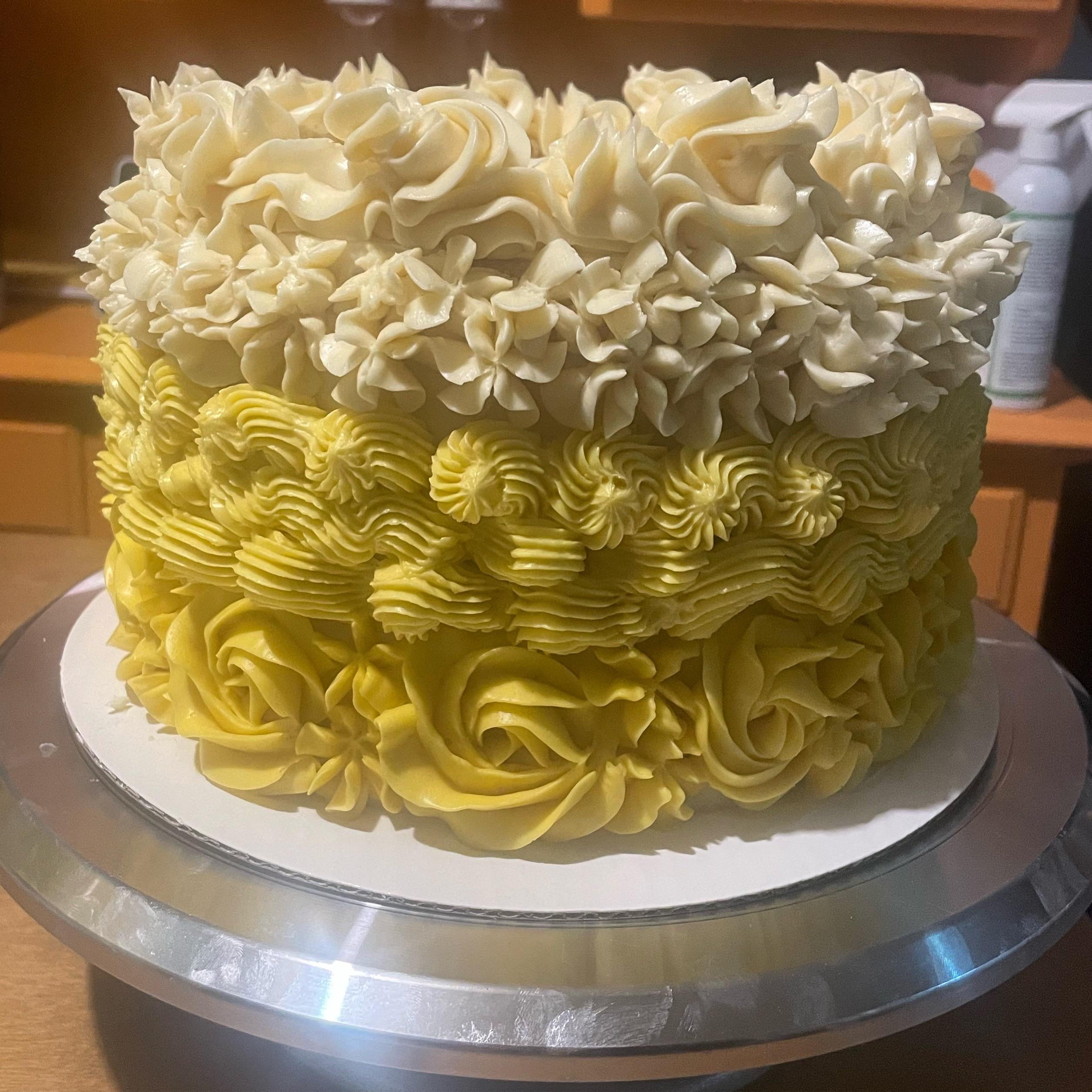 Just winging it. My kitchen was cold and the buttercream was stiff. I almost punted my piping bag across the room. Yellow cake with vanilla SMBC and raspberry preserves inside